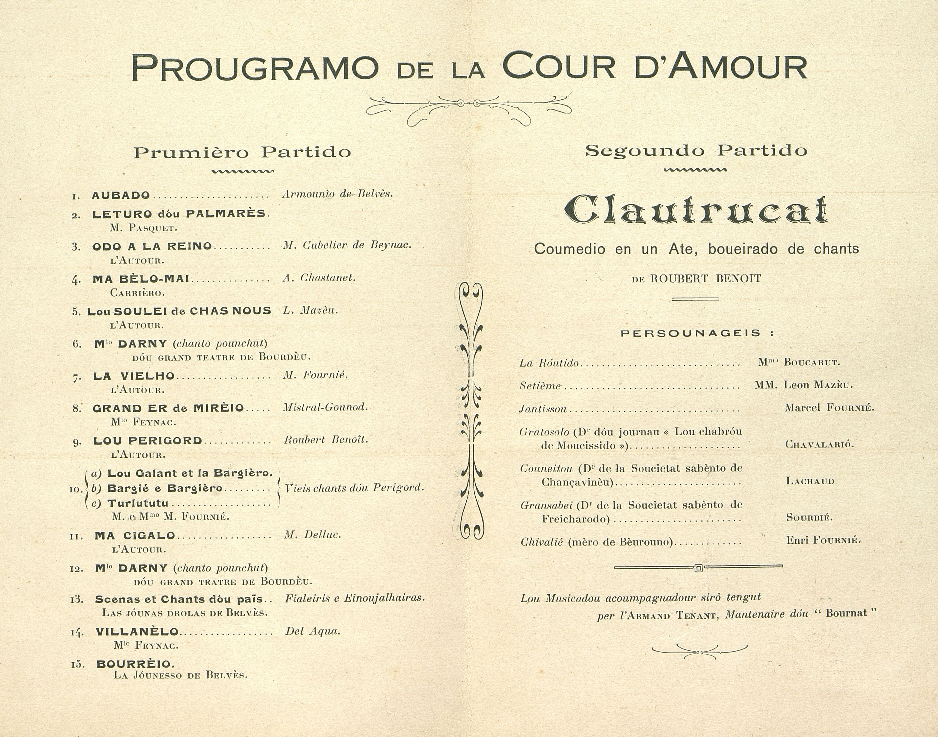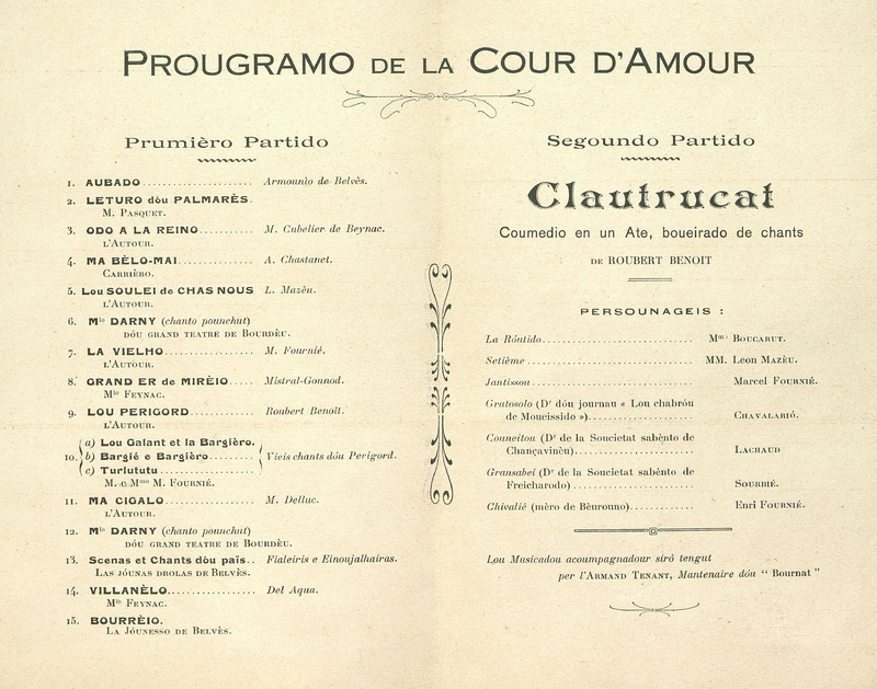 1. Aubado = Aubade / Armounio de Belvès = Harmonie de Belvès. 2. Leturo dou Palmarès = Lecture des résultats / M. Pasquet. 3.Odo a la reino = Ode à la reine / M. Cubelier de Beynac, l'autour = l'auteur. 4. Ma Bèlo-Mai = Ma belle-mère / A. Chastanet , acteur. 5. Lou solei de chas nous = Le soleil de chez nous / L. Mazèu ou L. Mazeau, l'autour = l'auteur. 6. Mlle Darny (chanto ponchut = chant classique) dou grand Teatre de Bourdeu = du grand Théâtre de Bordeaux. 7. La Vielho / M. Fournié, l'autour = l'auteur. 8. Grand er de Mireio = Grand air de Mireille / Mistral-Gounod ; Mlle Feyrac, chant. 9. Lou Perigord / Robert Benoit, l'autour = l'auteur. 10. Lou Galant et bargièro = Le Galant et la bergère ; Bargié e Bargièro = Berger et bergère ; Turlututu : veis chants dou Perigord = vieux chants du Périgord / M. et Mme Fournié. 11 . Ma Cigalo / M. Dellac , l'autour = l'auteur. 12. Mlle Darny (chanto ponchut = chant classique.) dòu grand Teatre de Bourdeu = du grand Théâtre de Bordeaux. 13. Scenas et chants dou païs = Scènes et chants du pays / Fialeiris e Einoujalhairas , Las Jounas Drollas de Belvès. 14. Villanélo = Villanelle / Del Aquau ; Mlle Feyrac, chant. 15. Bourreio = Bourrée / La Jounesso de Belvès.