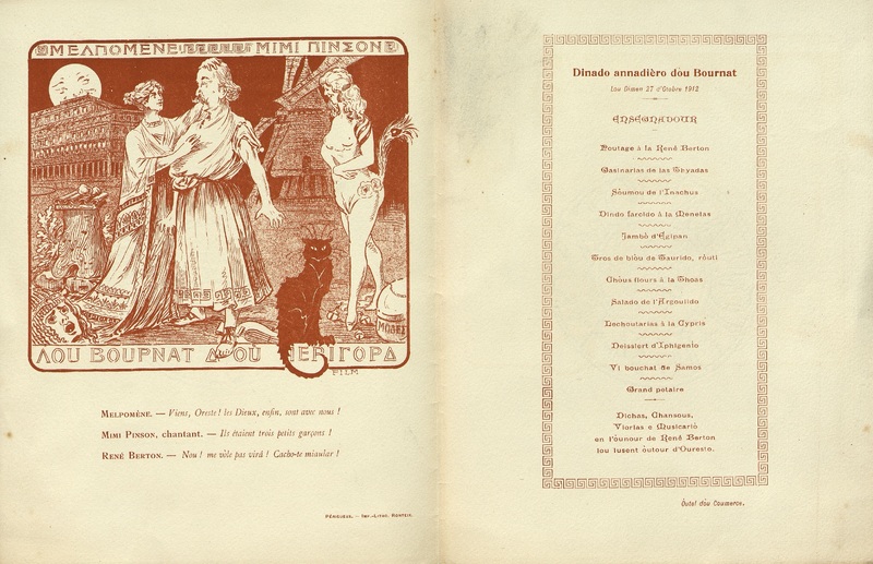 Plats servis : Poutage à la René Berton = Potage à la René Berton. Gasinarias de las Thyadas = Hors d’œuvres de la Thyadas. Sòumou de L'Inachus = Saumon de l'Inachus. Dindo farcido à la Menelas = Dinde farcie à la Menelas. Jambò d'Egipan = Jambon d'Egipan . Tros de biòu de Taurido, ròuti. Pièce de bœuf de Tauride rôti. Chòus flours à la Thoas. Choux fleurs à la Thoas. Salado de l'Argoulido = Salade de l'Argolide. Lechoutarias à la Cypris = Délices à la Cypris.Deissert d'Iphigenio = Dessert d'Iphigénie. VI bouchat de Samos = Six bouchées de Samos.