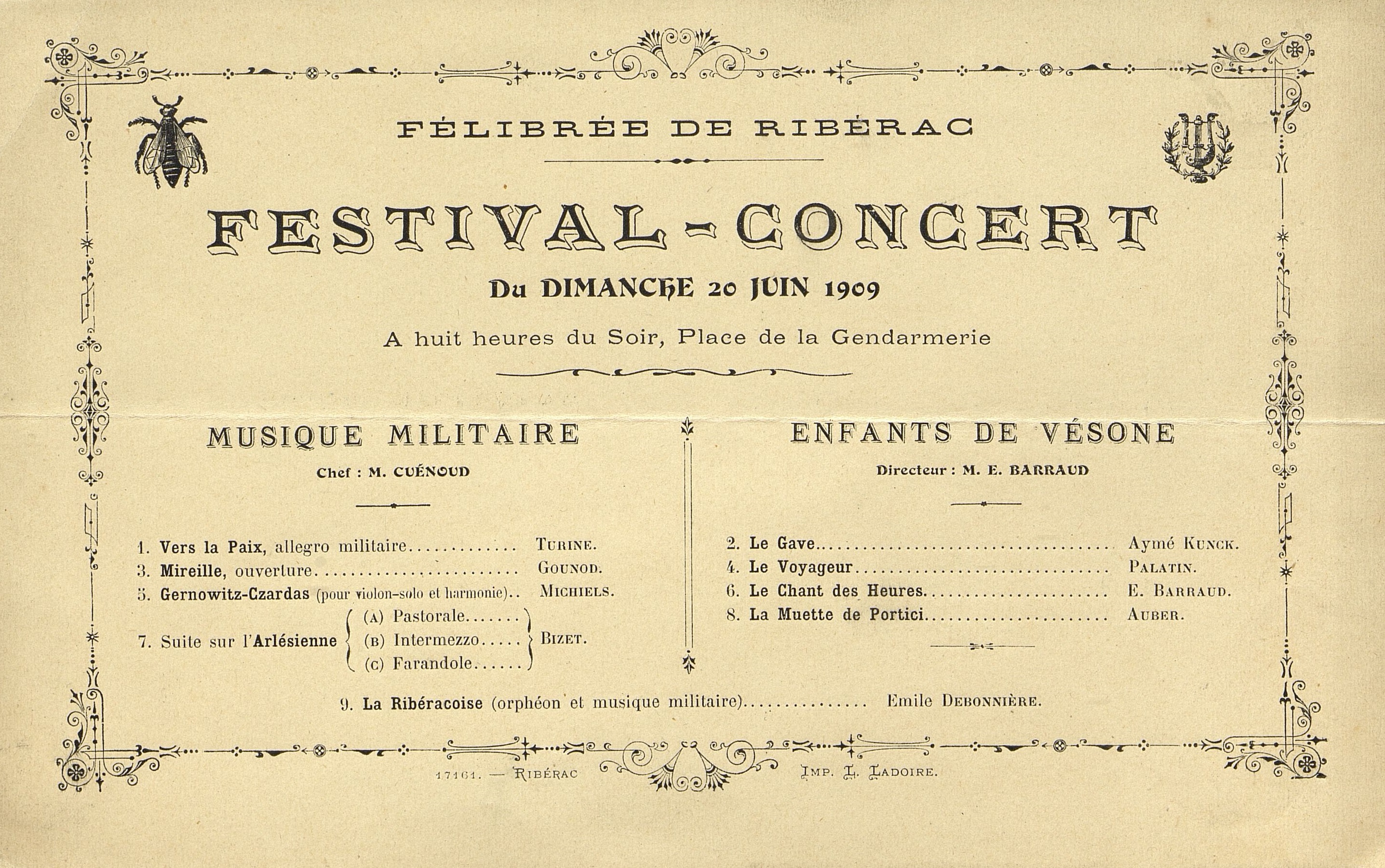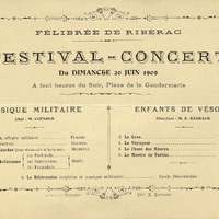 Festival-concert du 20 Juin 1909 à huit heures du soir place de la Gendarmerie.
