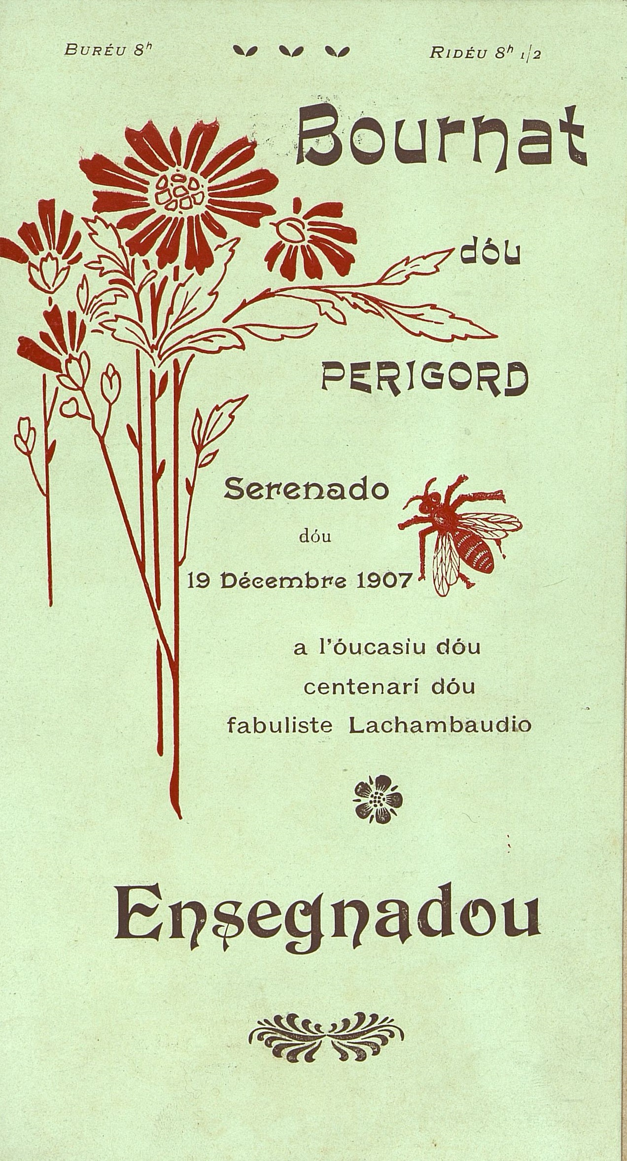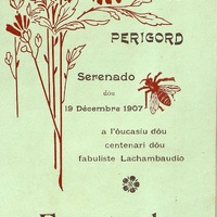 Dépliant illustré de motifs floraux du programme de la Taulado du 19 décembre 1907, en hommage au fabuliste Lachambeaudie.