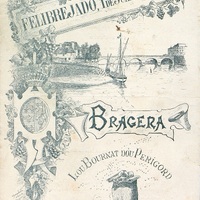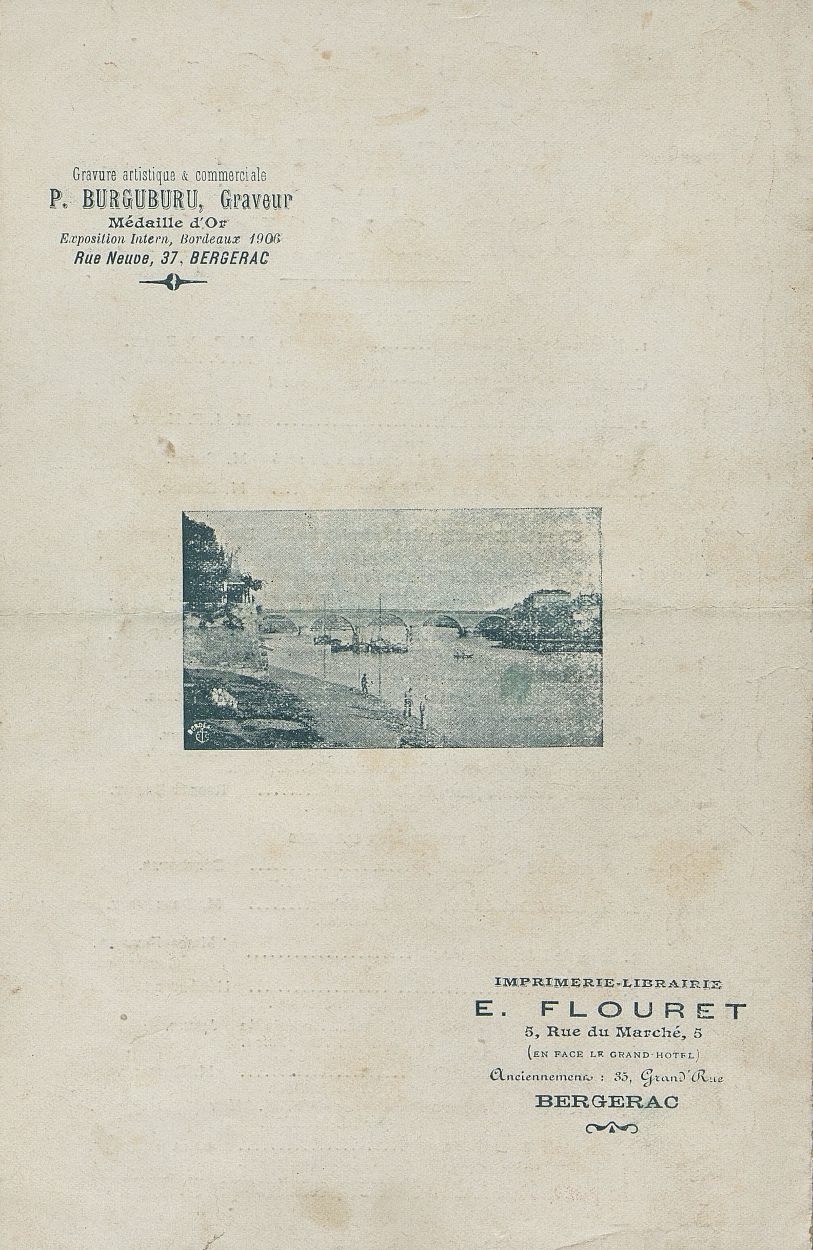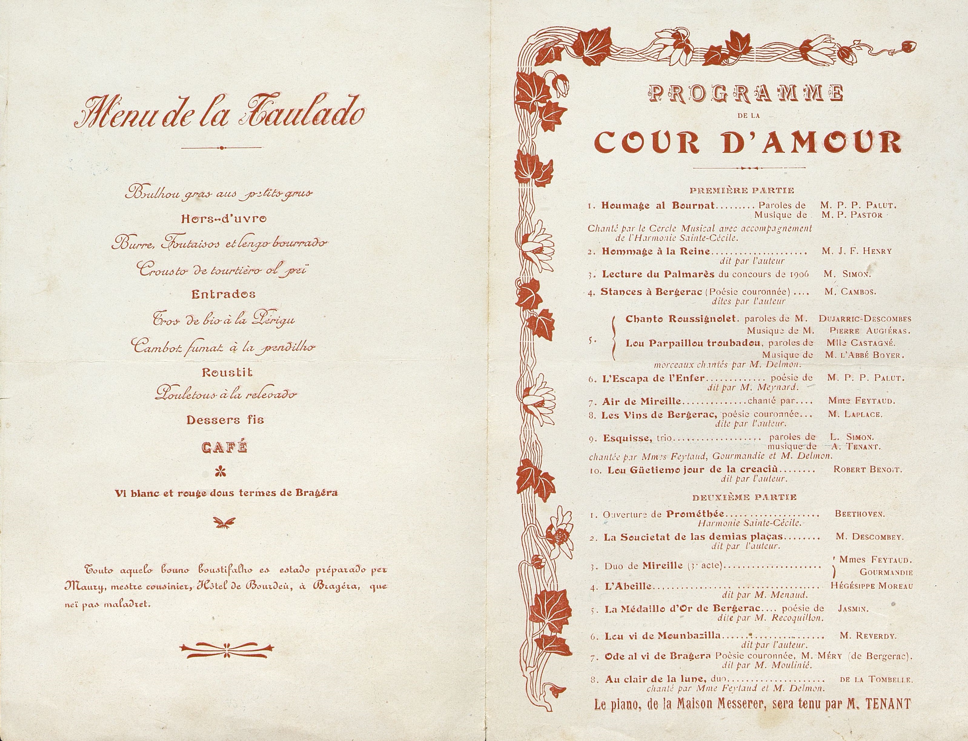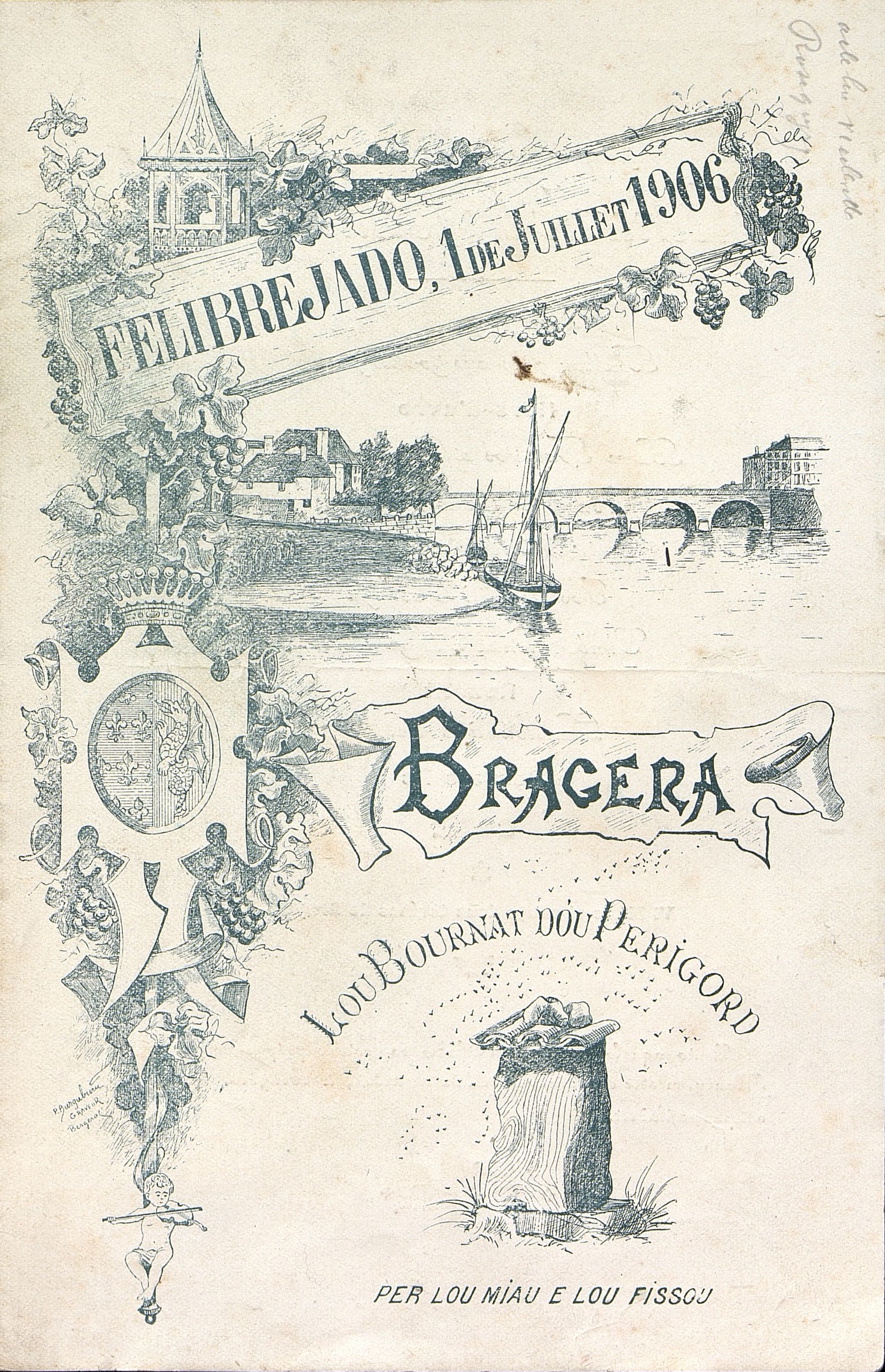 Programme et menu de la Félibrée de Bergerac du 1er juillet 1906. Armoiries de Bergerac : parti d'azur semé de fleurs de lys d’or, et de gueules à un dragon volant d’or lampassé du champ posé en pal.