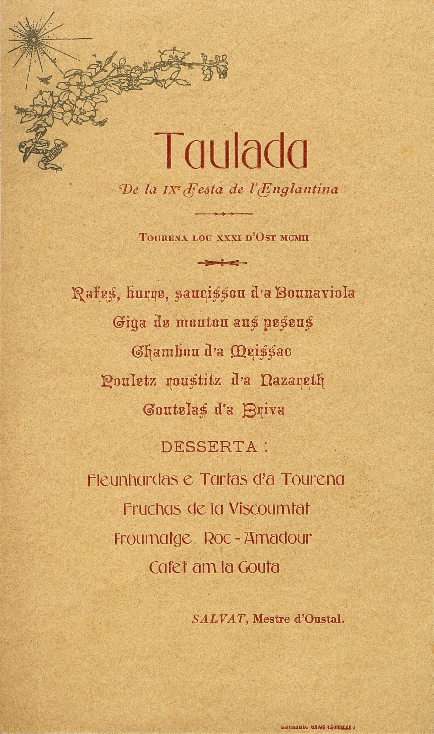 Menu : Rafes = Radis, Hurre = Pâté de tête, Saussicou d'a Bounaviola = Saucisson de Bounaviole. Giga de moutou aus peseus = Gigot de mouton aux pois. Chambou de Meissac = Jambon de Meissac. Pouletz roustitz d'a Nazareth = Poulets rôtis de Nazareth. Goutelas d'a Briva = Haricots verts de Brive. Desserta = Dessert : Fleunhardas e Tartas d'a Tourena = Flognardes et tartes de Turenne. Fruchas de la Viscountat = Fruits de la Vicomté. Froumatge Roc-Amadour = Fromage. Roc-Amadour. Cafet am la Gouta = Café avec Eau de vie