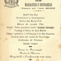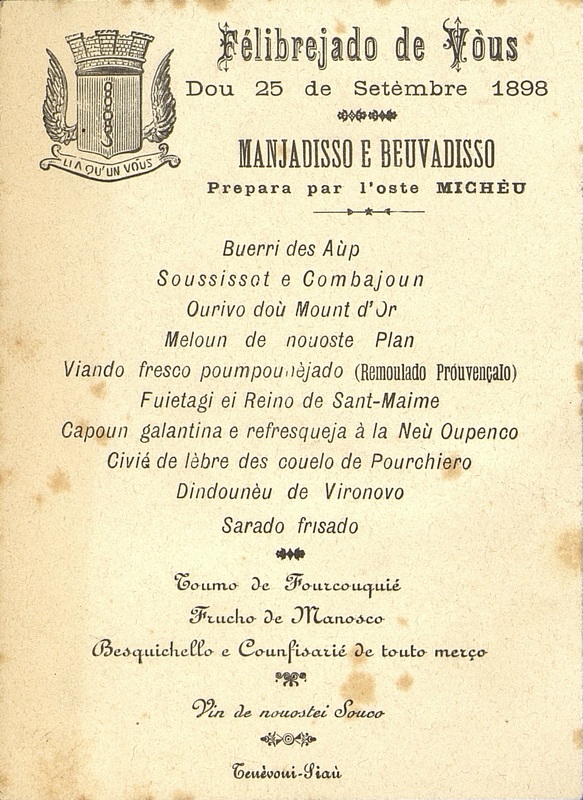 Plats servis : Buerri des Aùp = Beurre des Alpes. Soussissot et Combajoun = Saussicon et jambon. Ourivo doù Mount d'Or = Entrée (?) du Mont d'Or. Meloun de nouoste Plan = Melon de notre pays. Viando fresco poumpounèjado (Rémoulado Prouvençalo) = Viande froide en croûte (Mélange à la provençal). Fuietagi ei Reino de Sant-Maime = Feuilles et Reines de Saint-Maime. Capoun galantina e refresqueja à la Neù Oupenco = Galantine de chapon et rafraîchissements à la Nouvelle Oupenco (?) Civié de lèbre des Couelo de Pourchiero = Civet de lièvre des Coules de Porchières. Combajoun = Jambon. Dindounèu de Vironovo = Dindon de Vireneuve. Sarado frisado = Salade frisée. Toumo de Fourcouquié = Tome de Forcalquier. Frucho de Manosco = Fruits de Manosque. Besquichello e Counfisarié de touto merço = Petits biscuits et Confiseries diverses.