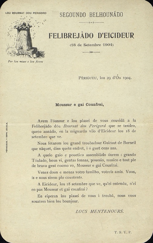 Invitation à la Félibrée d'Excideuil. Document imprimé et illustré.