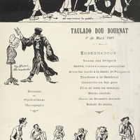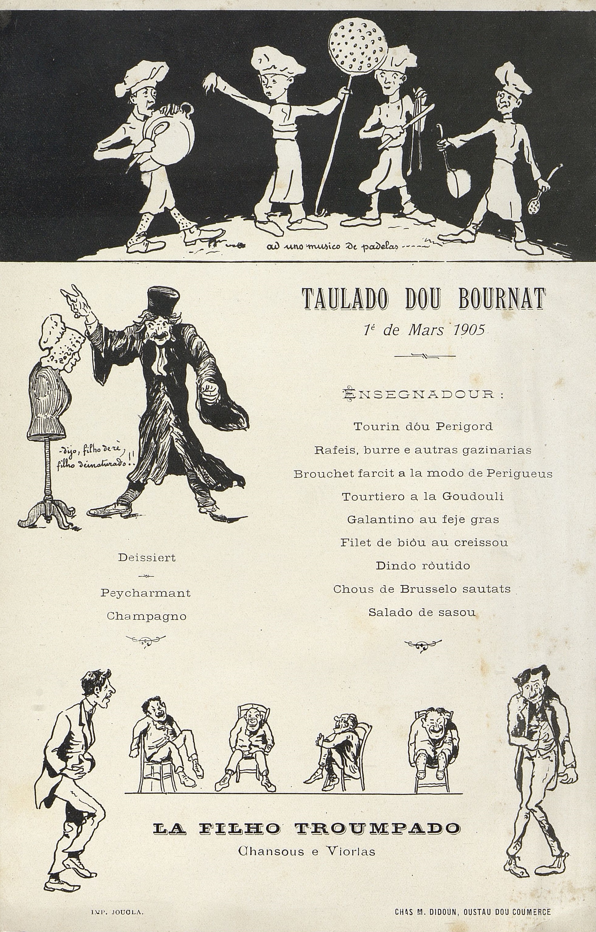 Menu : Tourin dou Perigord = Tourin du Périgord . Rafeis, burre e autres gazinarias = Radis, beurre et autres hors-d’œuvre. Brouchet farcit a la modo de Perigueus = Brochet farci à la Périgueux. Touriero a la Goudouli = Toutière à la Goudouli. Galantino au feje gras = Galantine de foie gras. Filet de biou au creissou = Filet de bœuf au cresson. Dindo routido = Dinde rôtie. Chous de Brusselo sautats = Choux de Bruxelles sautés. Salado de sasou = Salade de saison. Deissiert = Dessert.