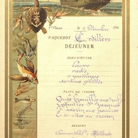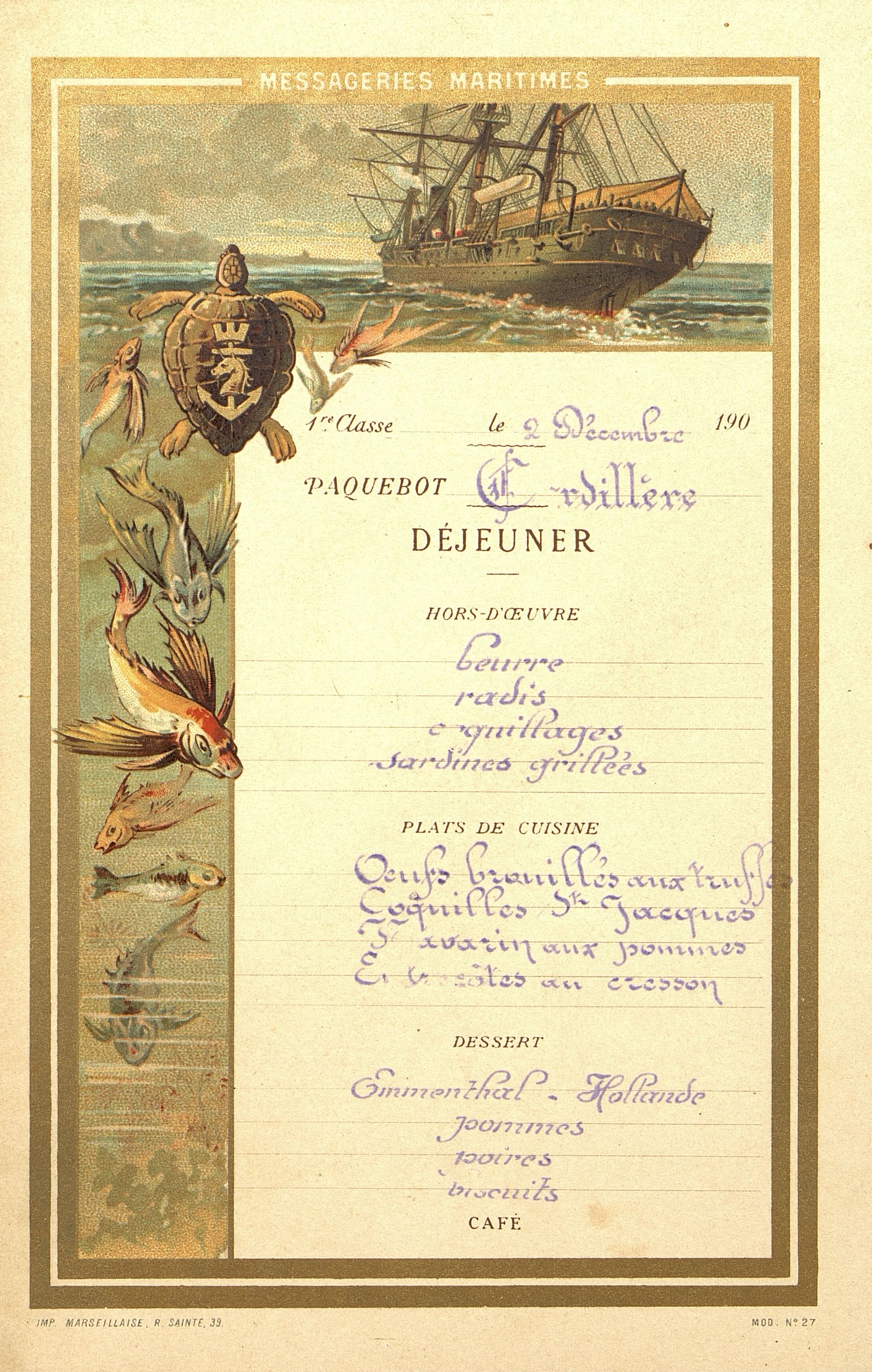 Plats servis : Hors d’œuvre : beurre, radis, coquillages, sardines grillées. Plats de cuisine : œufs brouillés aux truffes. Coquilles St-Jacques. Navarin aux pommes [de terre]. entrecôtes au cresson. Dessert : Emmenthal, Hollande, pommes, poires, biscuits. Café