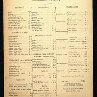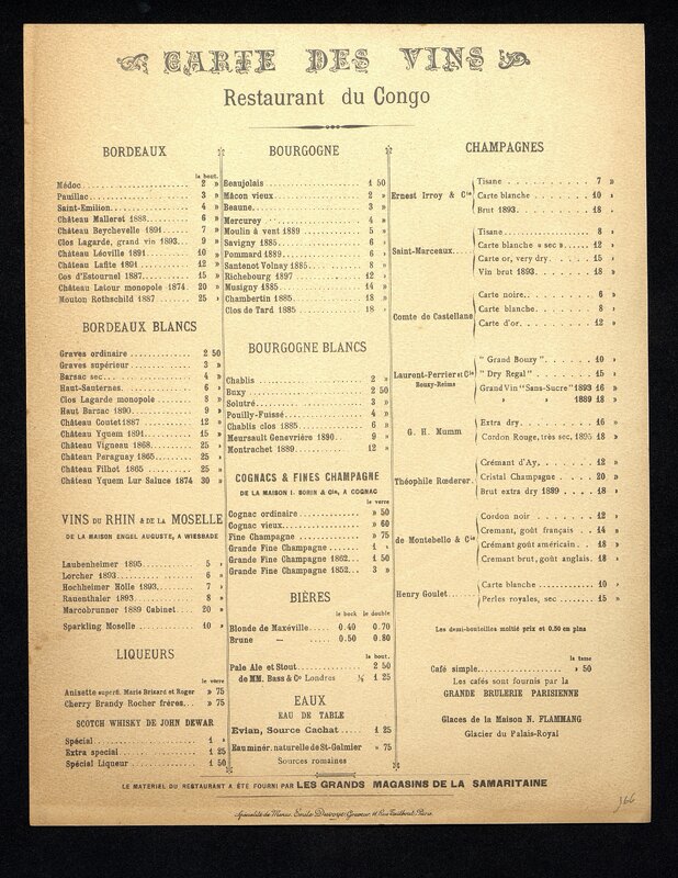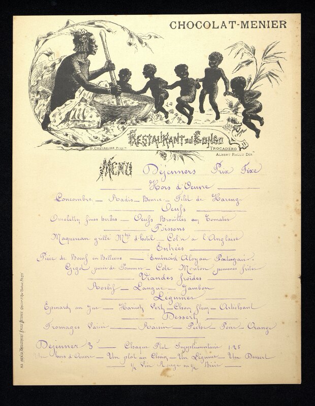 Carte menu du restaurant du Congo au Trocadéro. Publicité pour le Chocolat Menier. Au dos, la carte des vins.