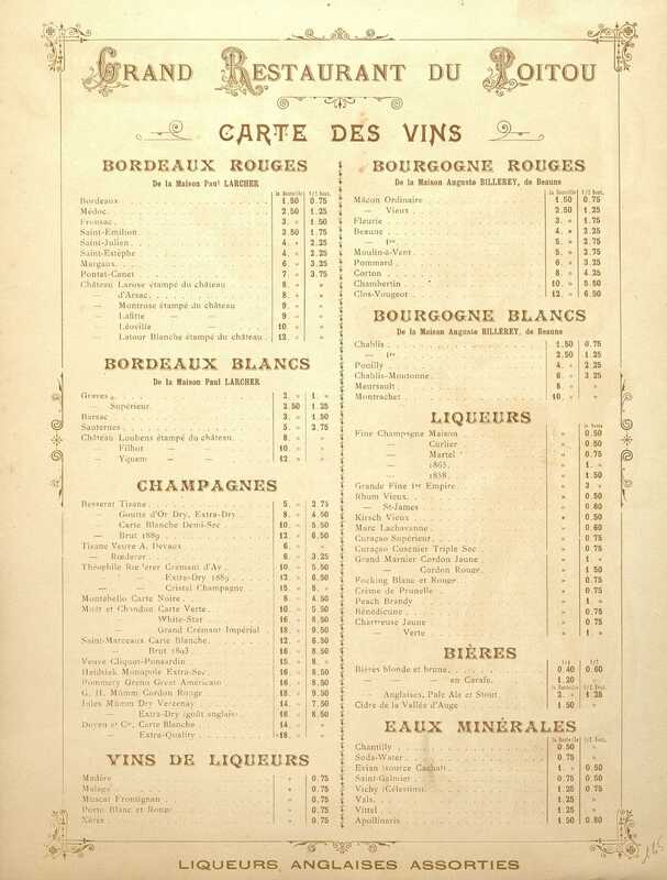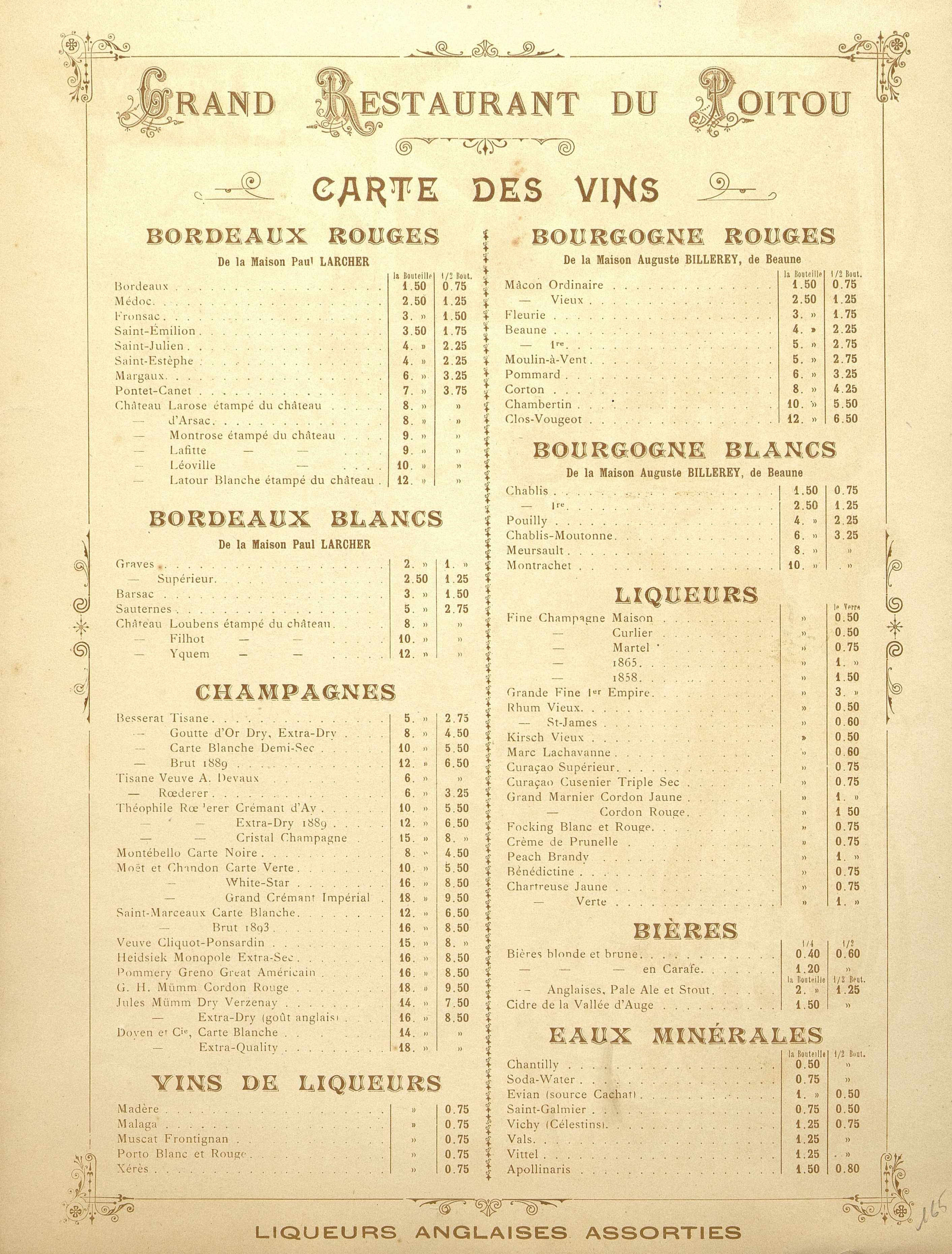 Carte-menu du Grand Restaurant du Poitou. Illustré et publicitaire. Au dos la carte des vins.