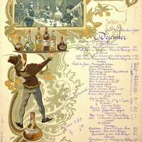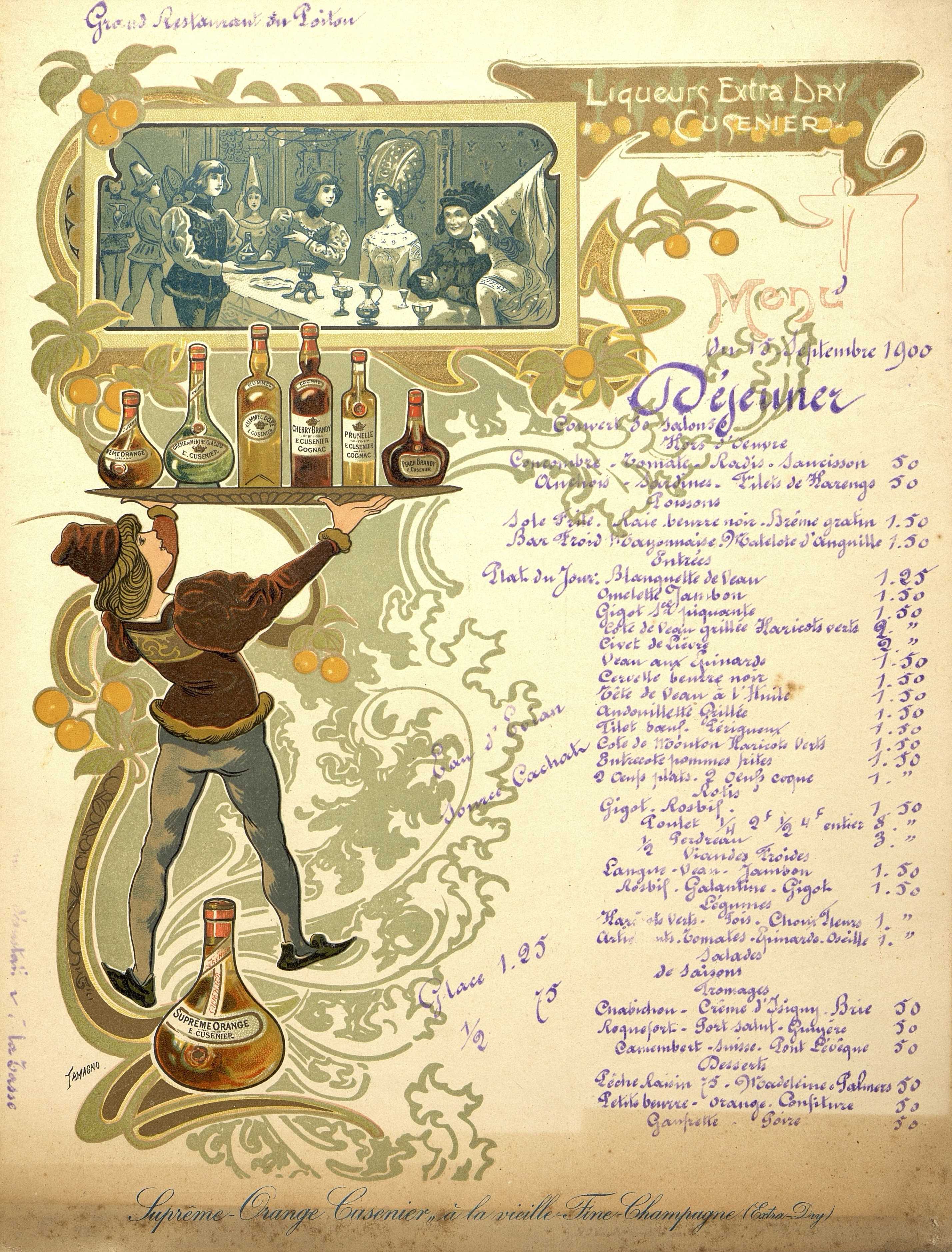 Illustration publicitaire pour les liqueurs de la Maison Cusenier. Un cartel de banquet médiéval . un page en habit du Quattrocento présente sur un plateau la production de ce producteur.