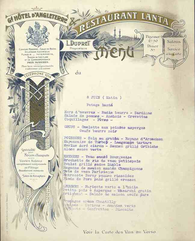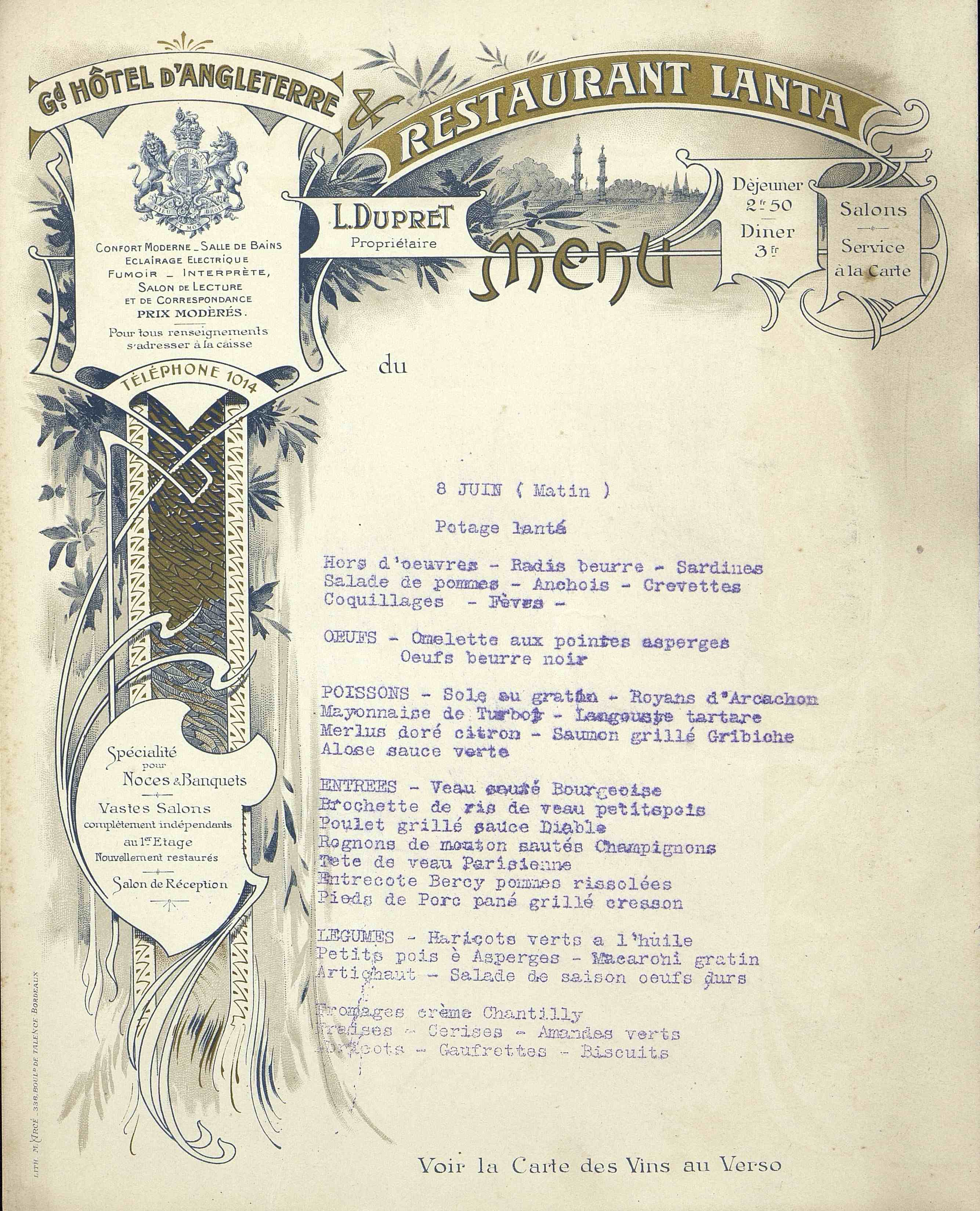 Menu du 8 juin [sans année] et carte des vins du Restaurant Lanta Grand Hôtel d'Angleterre. Pré-imprimé avec un texte saisi à la machine à écrire. Au dos, la carte des vins et liqueurs avec les tarifs.