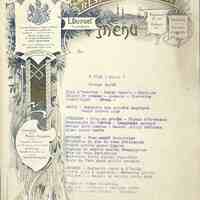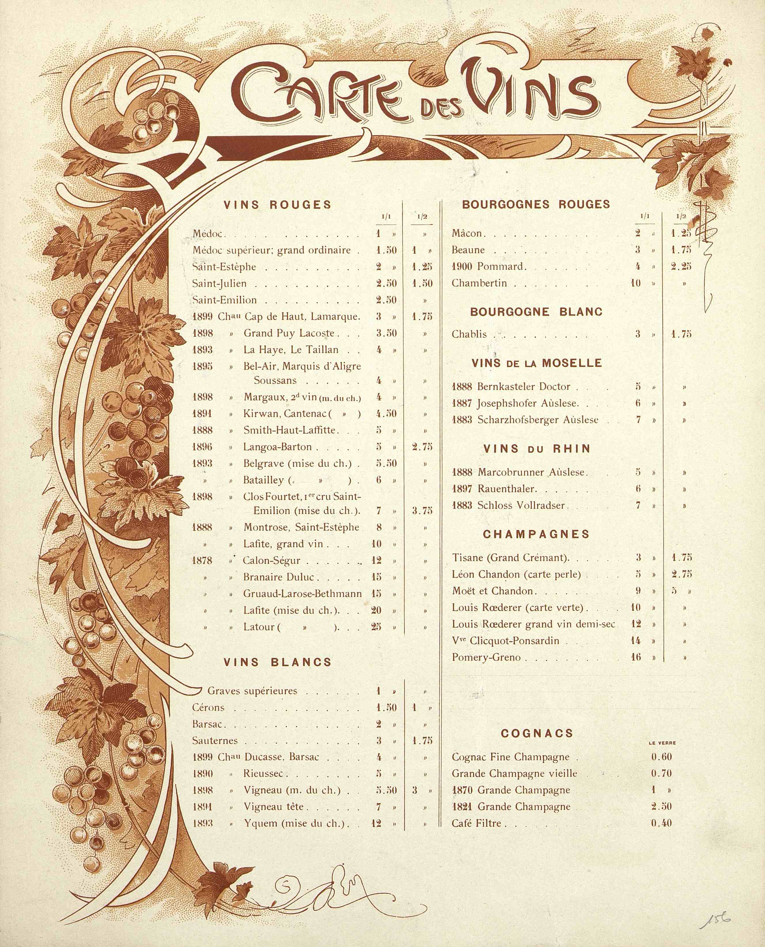 Potage Lanté ; Hors d’œuvres : Radis beurre, Sardines, Salade de pommes, Anchois, Crevettes, Coquillages, Fèves ; Œufs : Omelette aux pointes d'asperges, Œufs beurre noir ; Poissons : Sole au gratin, Royans d'Arcachon, Mayonnaise de Turbot, Langouste tartare, Merlus doré citron, Saumon grillé Gribiche, Alose sauce verte ; Entrées : Veau sauté Bourgeoise, Brochette de ris de veau petits pois, Poulet grillé Diable, Rognons de mouton sautés Champignons, Tête de veau Parisienne, Entrecôte Bercy pommes rissolées, Pieds de Porc panés grillés cresson ; Légumes : Haricots verts à l'huile, Petits pois et Asperges, Macaroni gratin, Artichaut, Salade de saison œufs durs ; Fromages crème Chantilly, Fraises, Cerises, Amandes vertes, Abricots, Gaufrettes, Biscuits.