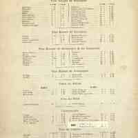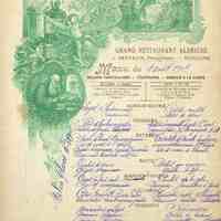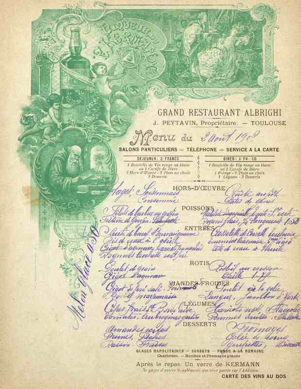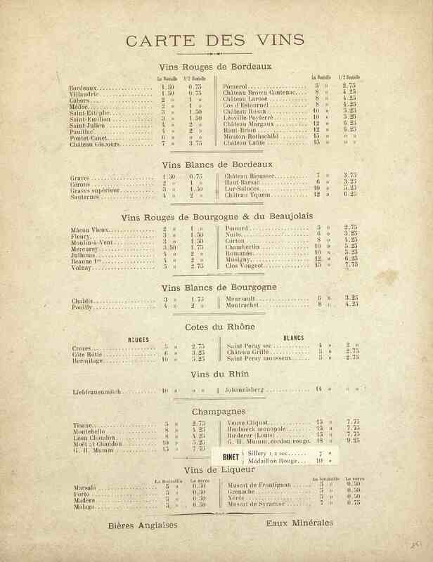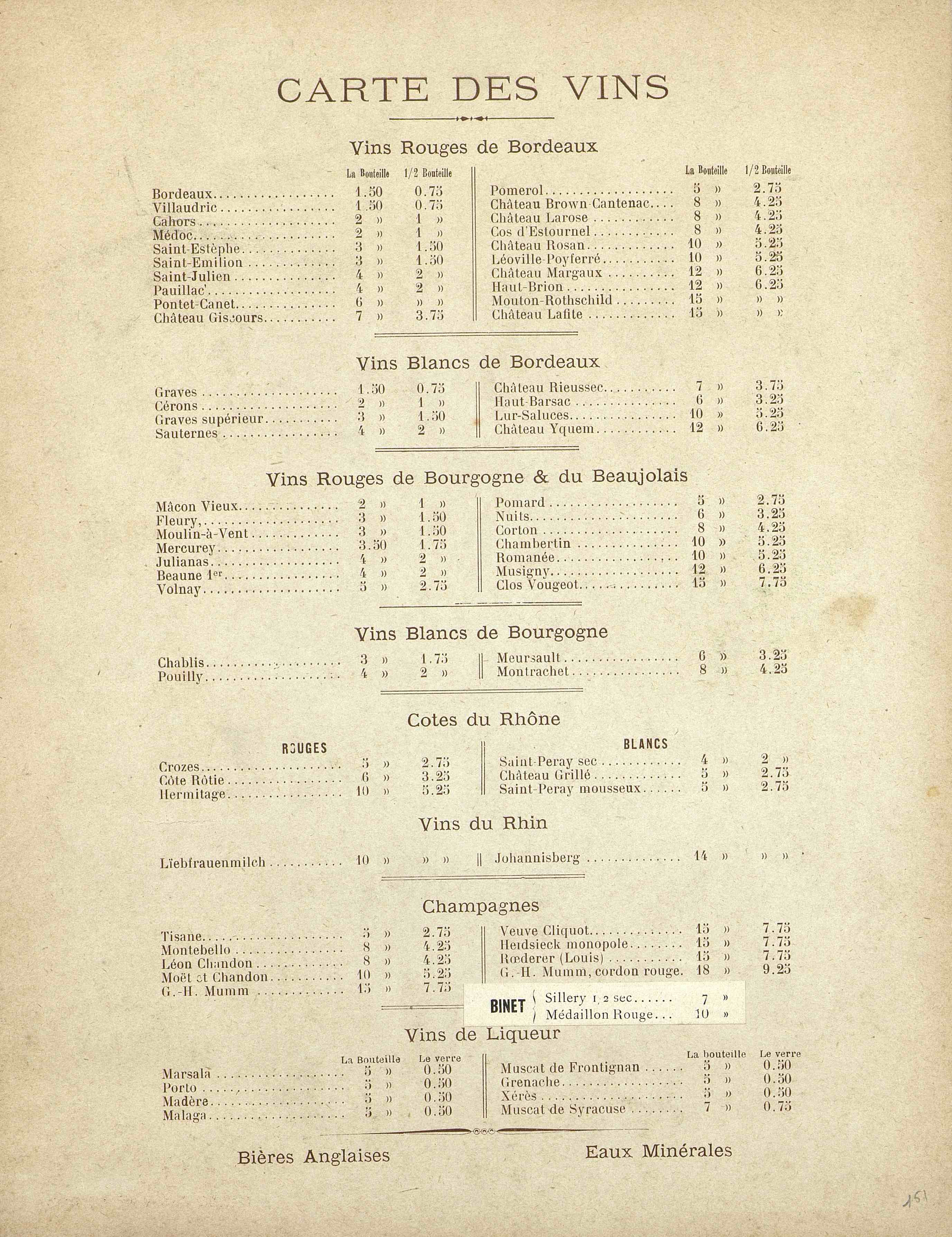 Boissons : Carte des vins au dos : Vins Rouges de Bordeaux : Bordeaux. Villaudric. Cahors. Médoc. Saint-Estèphe. Saint-Emilion. Saint-Julien. Paulliac. Pontet-Canet. Château-Giscours. Pommerol. Château Brown-Cantenac. Château Larose. Cos d'Estournel. Château Rosan. Léoville-Poyferré. Château Margaux. Haut-Brion. Mouton-Rotschild. Château Lafite. Vins blancs de Bordeaux : Graves. Cérons. Graves supérieurs. Sauternes. Château Rieussec. Haut-Barsac. Lur-Saluces. Château Yquem. Vins rouges de Bourgogne & du Beaujolais. Mâcon Vieux. Fleury. Moulin-à-Vent. Mercurey. Julianas. Beaune Premier. Volnay. Pomard. nuits. Corton. Chambertin. Ramonée. Musigny. Clos Vougeot. Vins Blancs de Bourgogne : Chablis. Pouilly. Meursault. Montrachet. Côte du Rhône : Rouges : Crozes. Côte Rôtie. Hermitage. Blancs : Saint-Peray sec. Château Grillé. Saint-Peray mousseux. Vins du Rhin : Lïebfrauenmilch. Johannisberg. Champagnes : Tisane. Montebello. Léon Chandon. Moët et Chandon. G. -H. Mumm. Veuve Cliquot. Heidsieck monopole. Roederer (Louis). G. -H. Mumm, cordon rouge. Binet -Sillery demi-sec. Binet-Médaillon Rouge. Vins de Liqueur : Marsala. Porto. Madère. Malaga. Muscat de Frontignan. Grenache. Xérès. Muscat de Syracuse. Bières anglaises. Eaux minérales.