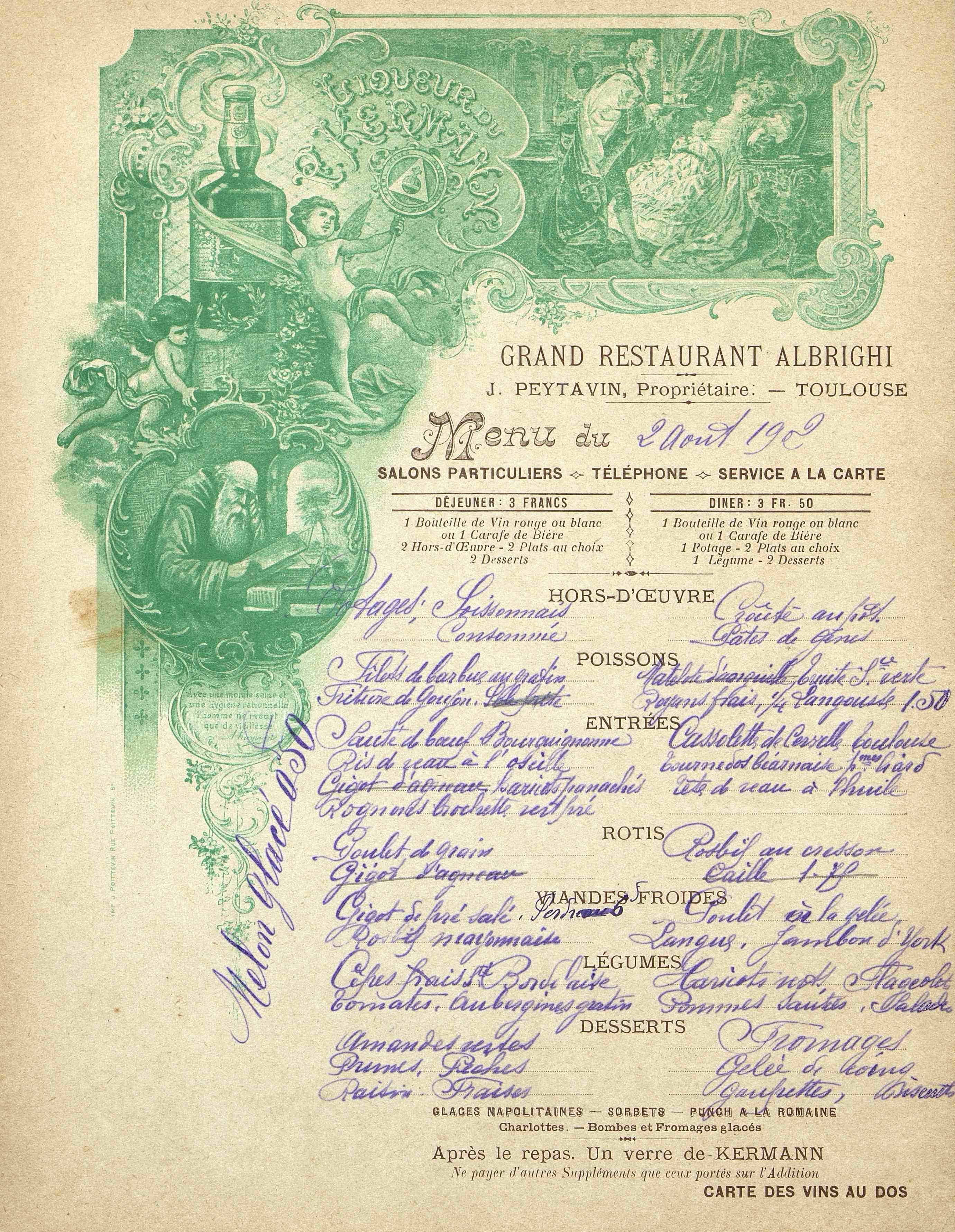 Carte des menus et des vins du Grand Restaurant Albrighi de Toulouse