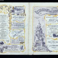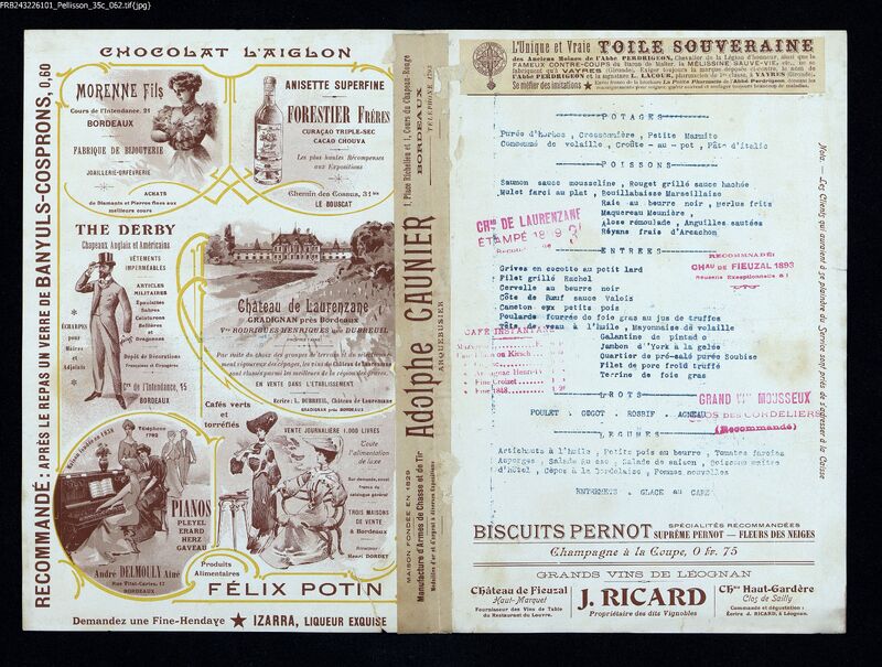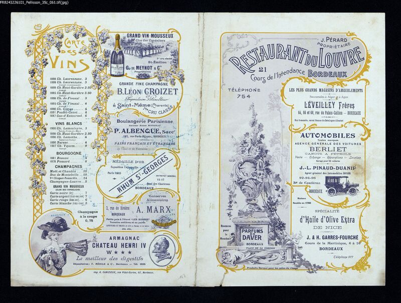 Carte du restaurant du Louvre à Bordeaux 21 Cours de l'Intendance avec des publicités commerciales autour des menus au recto et la cartes des boissons au verso sur deux pages