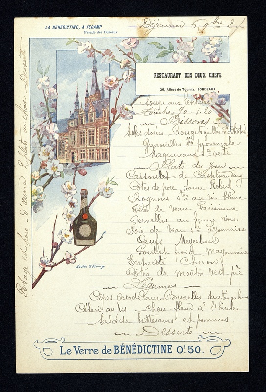 Menu du Restaurant des deux chefs de Bordeaux illustré par la façade des bureaux de La Bénédictine de Fécamp. Imprimé avec la carte d'un restaurant en manuscrit. Sans date.