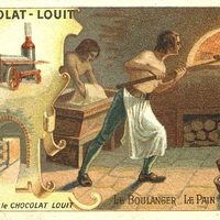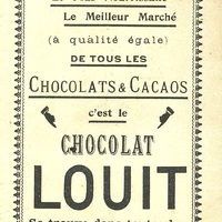 Carte publicitaire illustrée d'un dessin d'une boulangerie pour le Chocolat Louit et au verso le texte commercial.