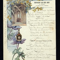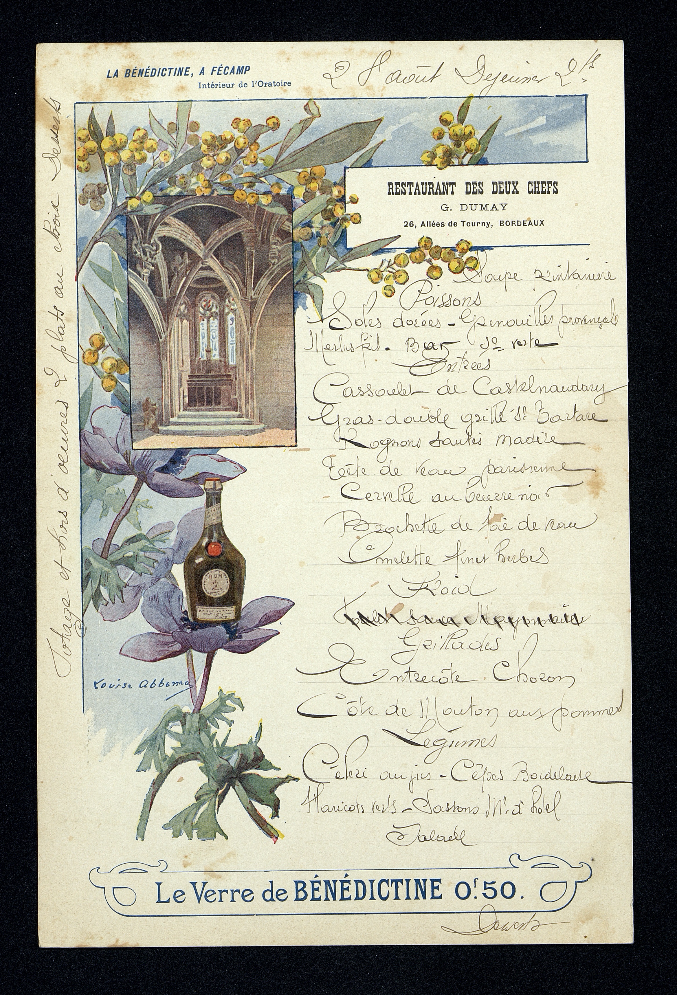 Menu du Restaurant des Deux-Chefs à Bordeaux du 28 Août illustré par l'intérieur de l'Oratoire de l'abbaye "La Bénédictine" de Fécamp.