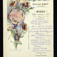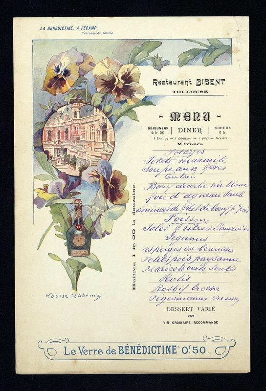 Menu du restaurant Bibent de Toulouse illustration de La Bénédictine de Fécamp avec la terrasse Renaissance. Pré-imprimé complété de manière manuscrite.