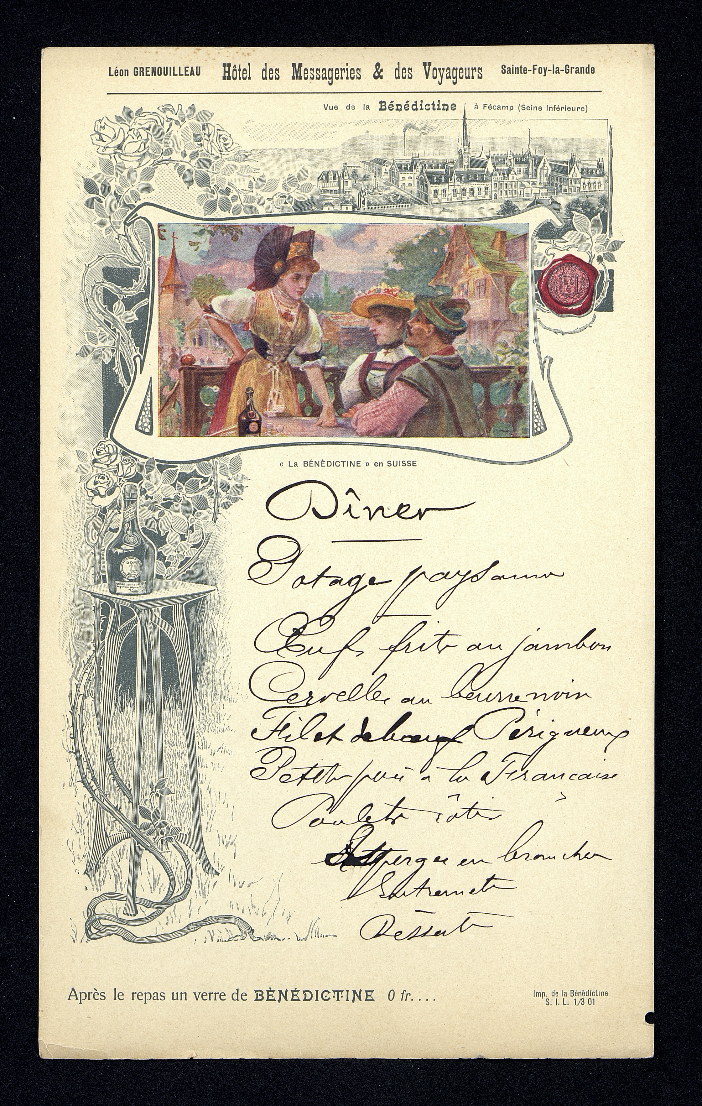 Menu publicitaire au thème : La Bénédictine en Suisse. Impression S.I.L. 1/3 01. Illustration avec une vignette en couleur dans un paysage de village suisse autour d'une table sur balcon avec trois suisses en costume folklorique. (St-Gall, Appenzell, Berne)