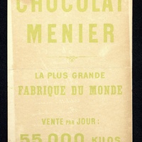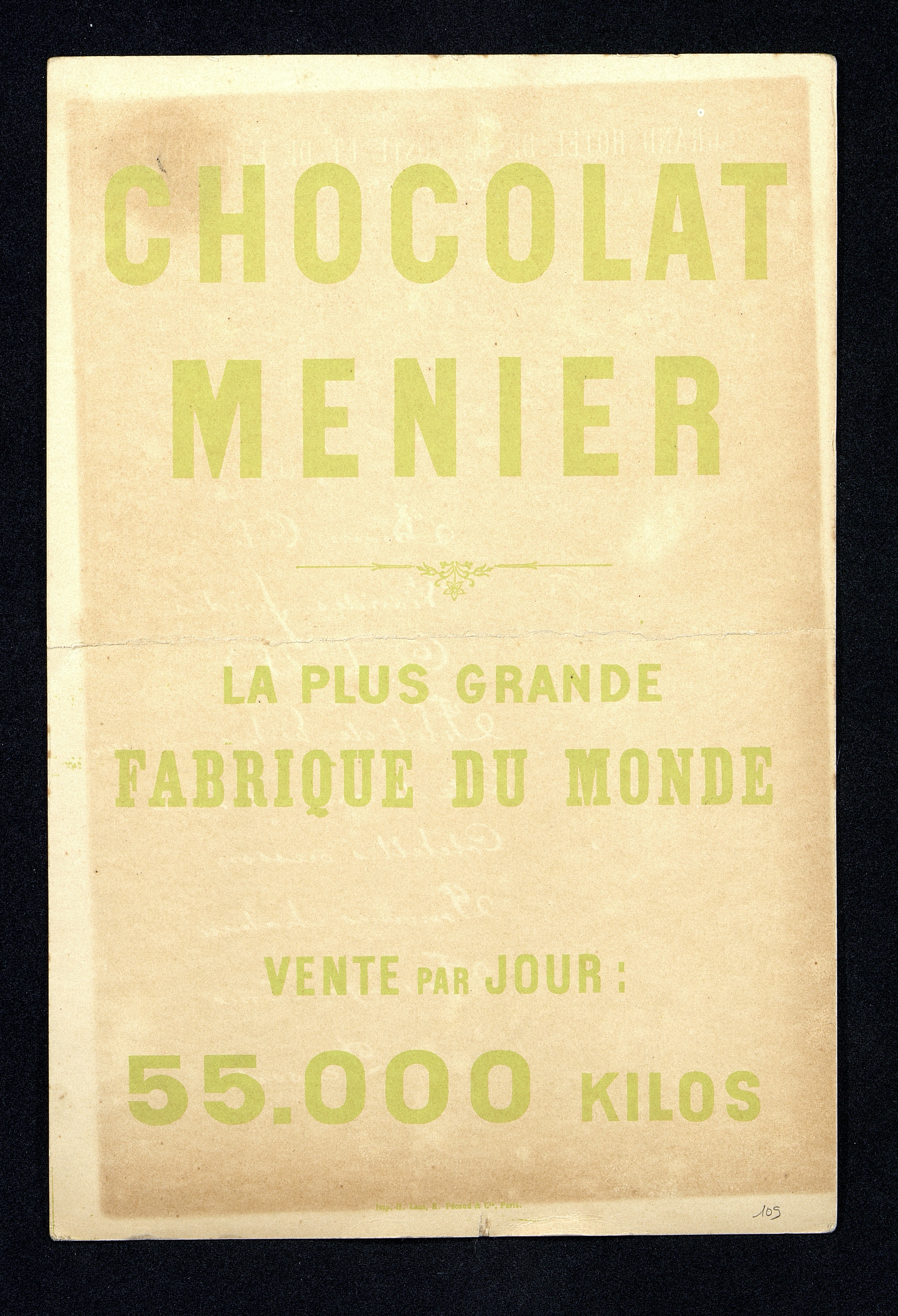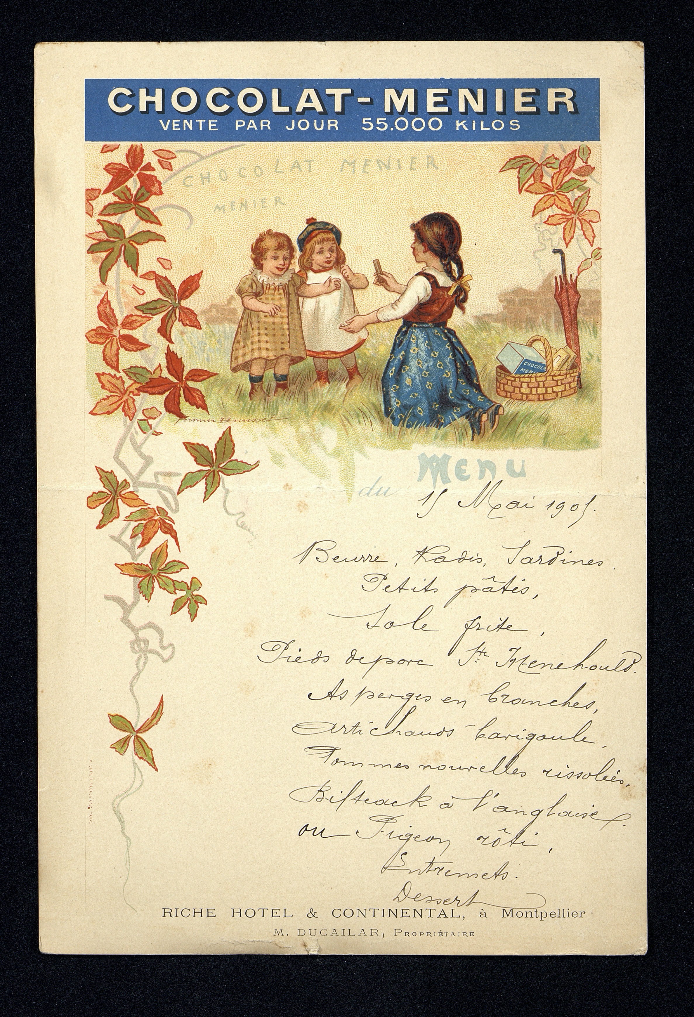 Pré-imprimé illustré et complété en manuscrit. Au recto le menu et au verso page entière consacrée à la publicité du Chocolat Meunier.