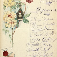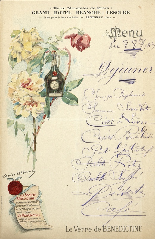 Menu du déjeuner du 8 octobre 1903 de l'Hôtel Branche-Lescure à Alvignac avec illustration La Bénédictine par Louise Abbema. Publicité pour les Eaux Minérales de Miers.