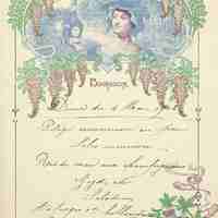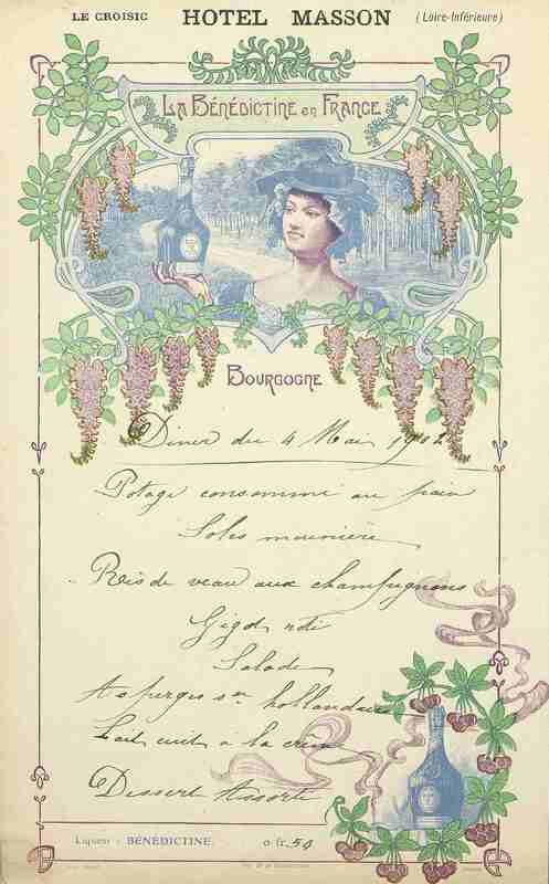 Menu publicitaire de l'Hôtel Masson au Croisic avec pour thème ; La Bénédictine en France : Bourgogne. Illustré.