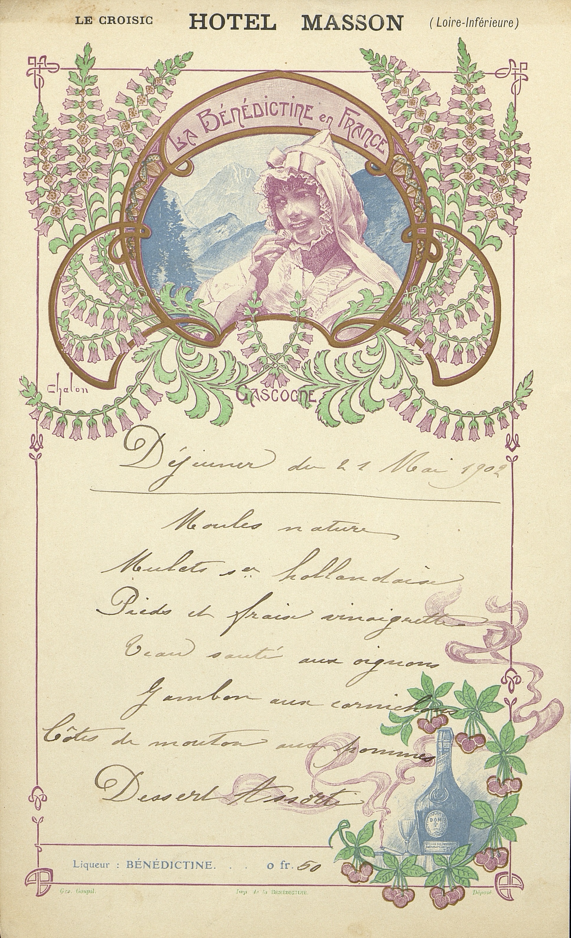 Menu publicitaire de l'Hôtel Masson du déjeuner du 21 mai 1902 au Croisic illustré par La Bénédictine en France : Gascogne