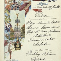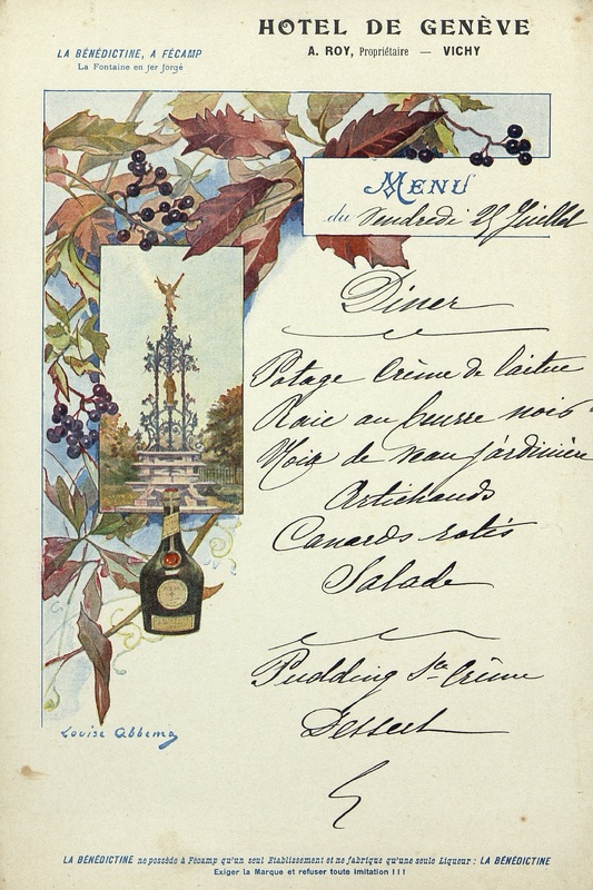 Menu de l'Hôtel de Genève à Vichy du Vendredi 25 juillet avec illustration de la fontaine en fer forgé de la Bénédictine à Fécamp avec des feuillages d'érable.