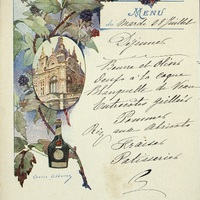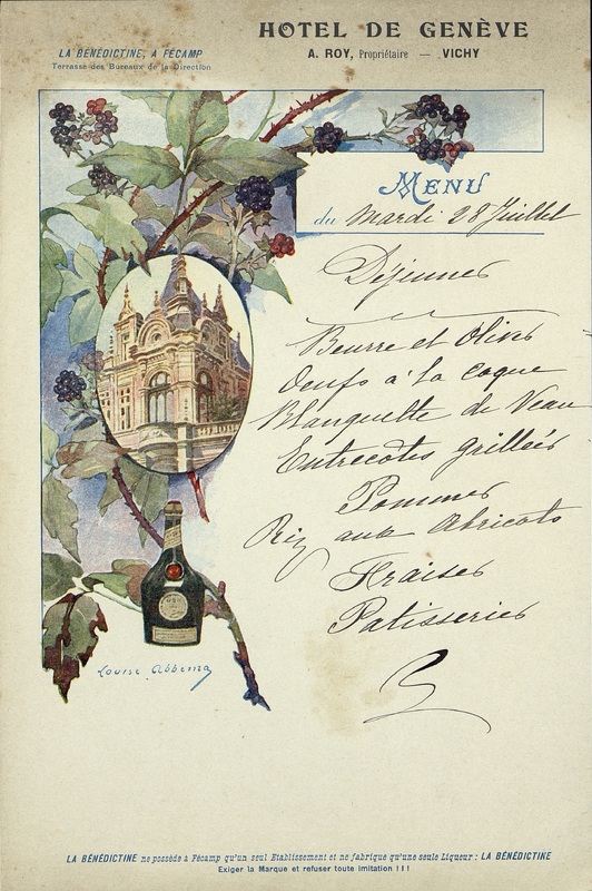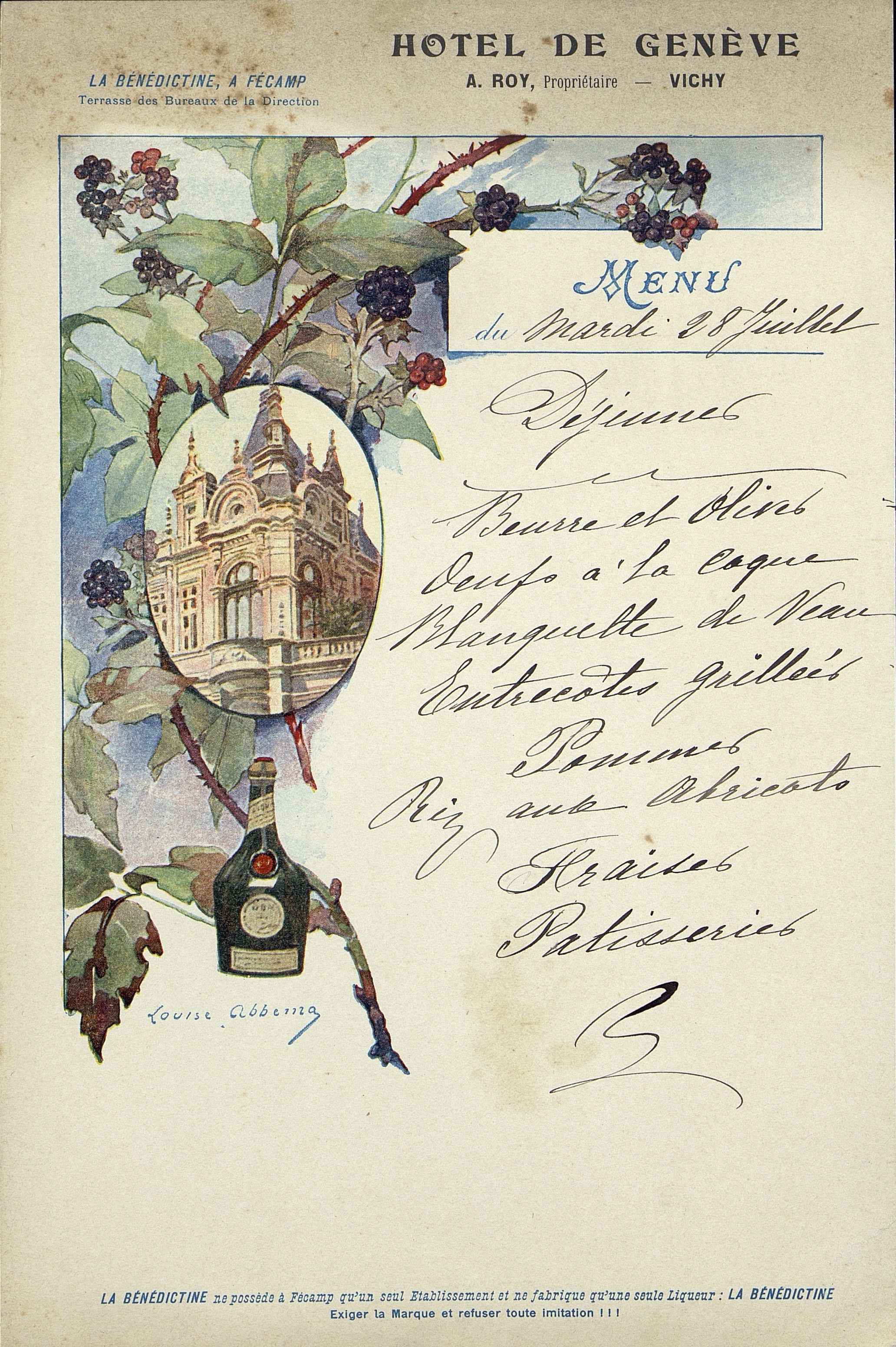 Menu illustré et manuscrit du 28 juillet à l' Hôtel de Genève à Vichy.