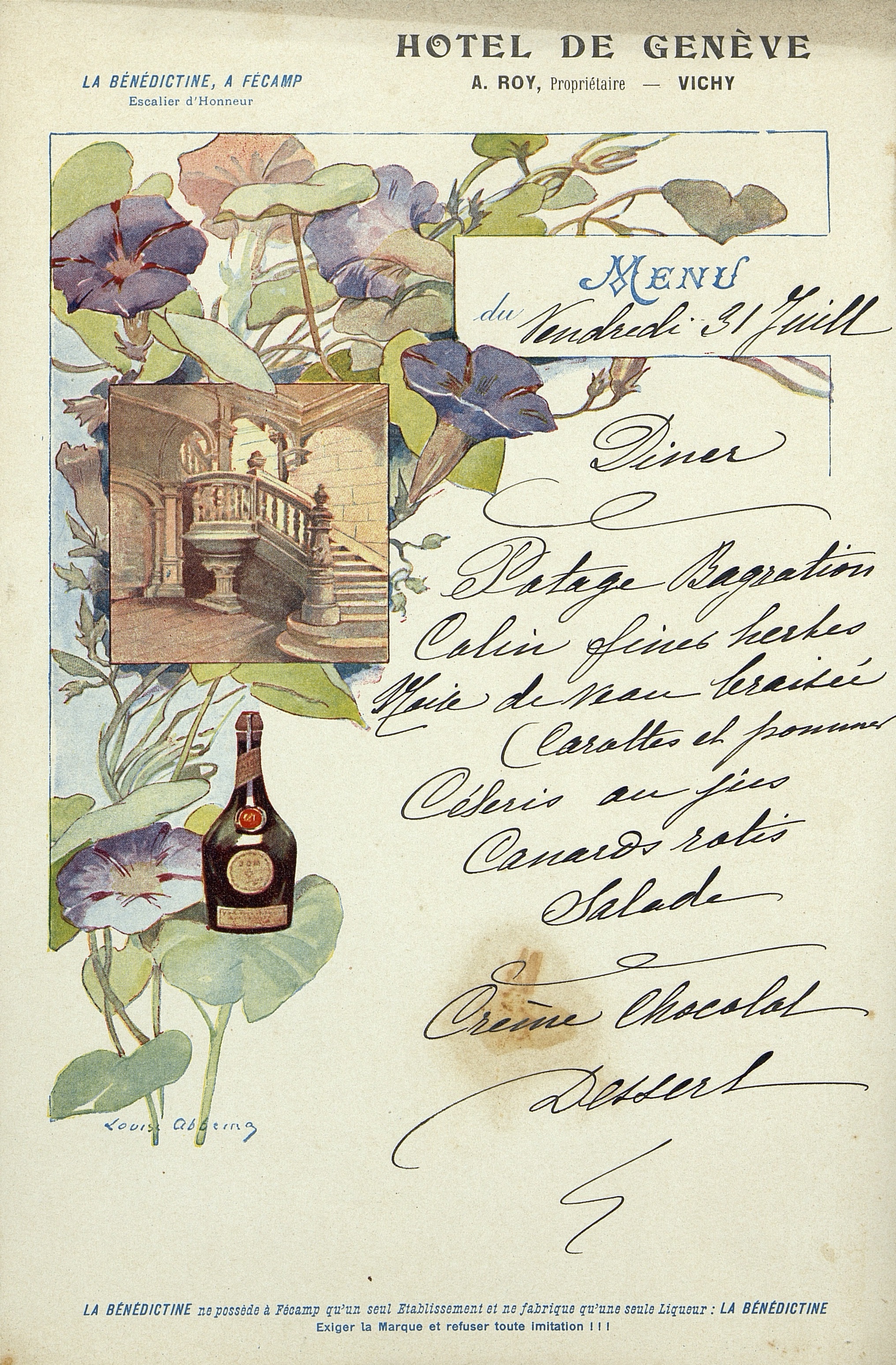 Menu illustré du 31 juillet à l'Hôtel de Genève, mais sans l'année.