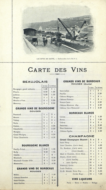 Menu du samedi soir au recto et carte imprimée des vins au verso avec photographie des quais de Saône et embarcadère de la H.P.L. Vignette du bâtiment. Carte postale détachable.