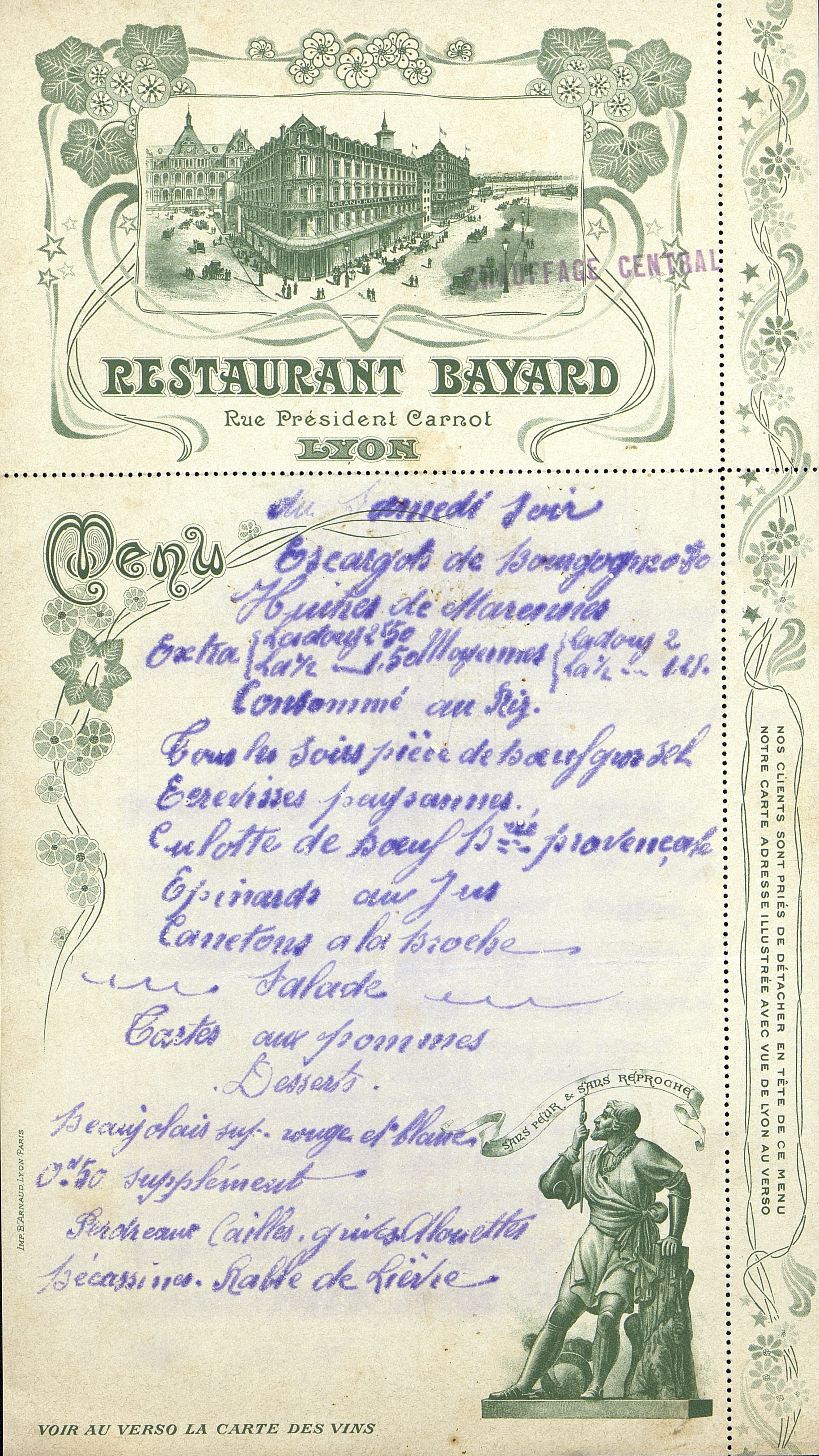 [Carte de restaurant. Lyon]