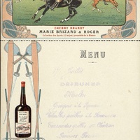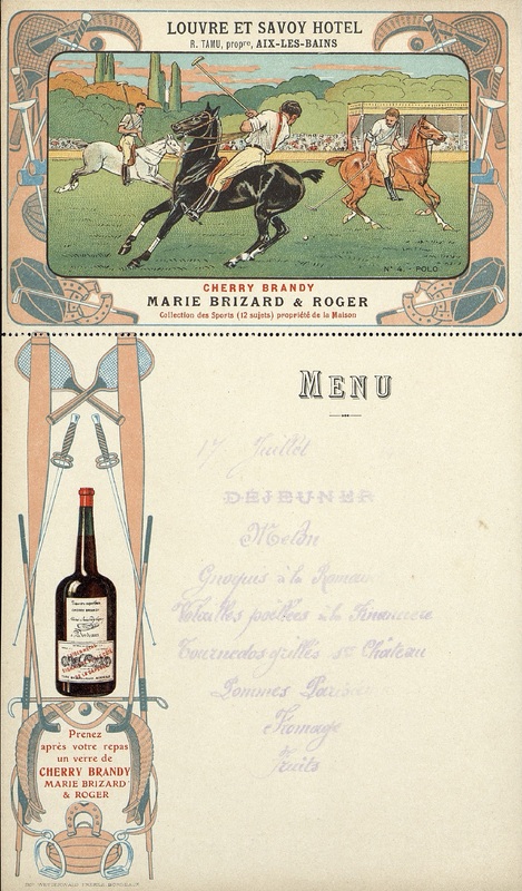 Menu avec carte-postale détachable. Série n°4 : Le polo. Publicité pour le Cherry Brandy de la marque Marie Brizard & Roger.