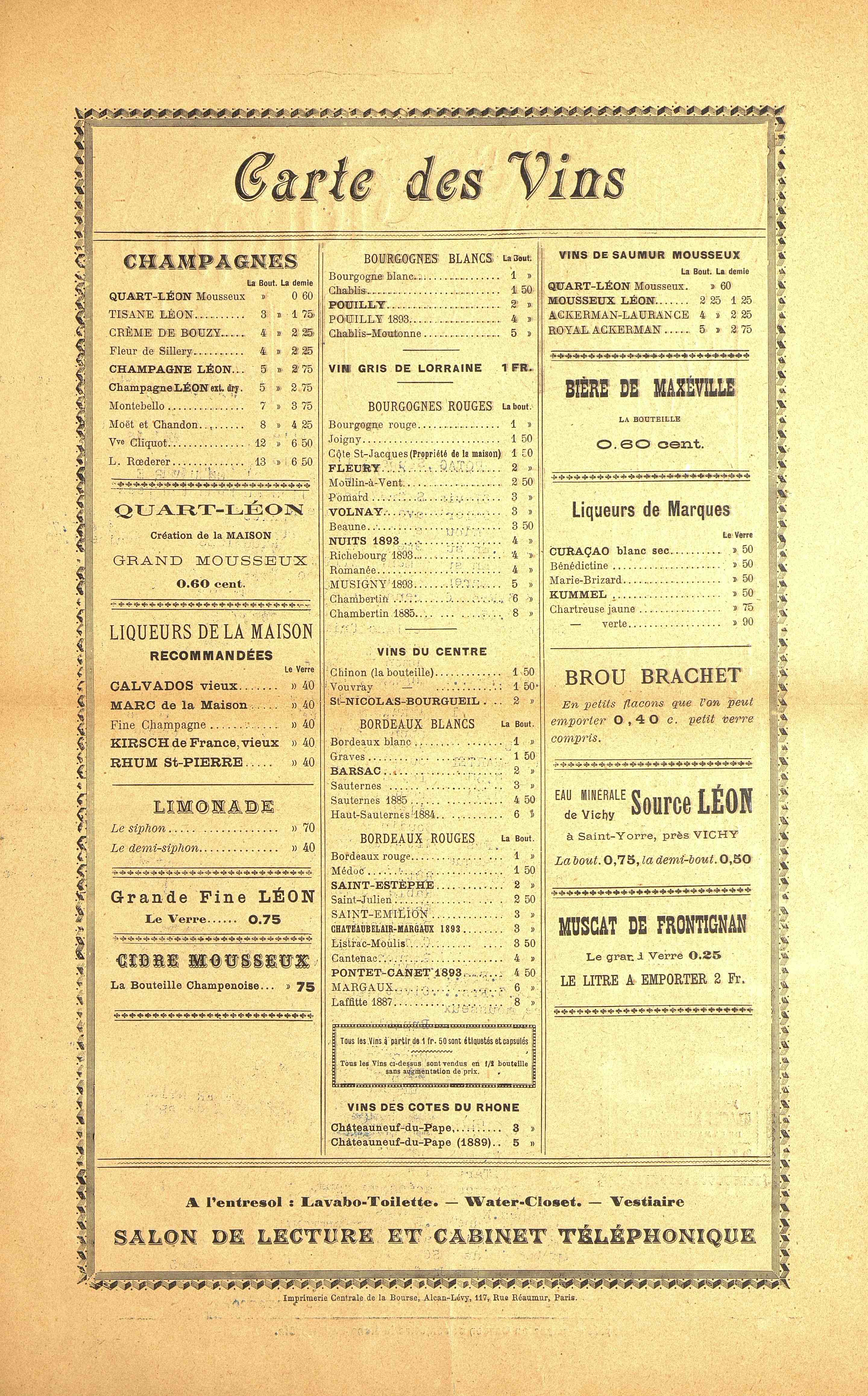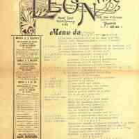 Restaurant Léon, menu-affiche ronéotypé. Nombreuses annonces publicitaires. Carte des vins au dos.