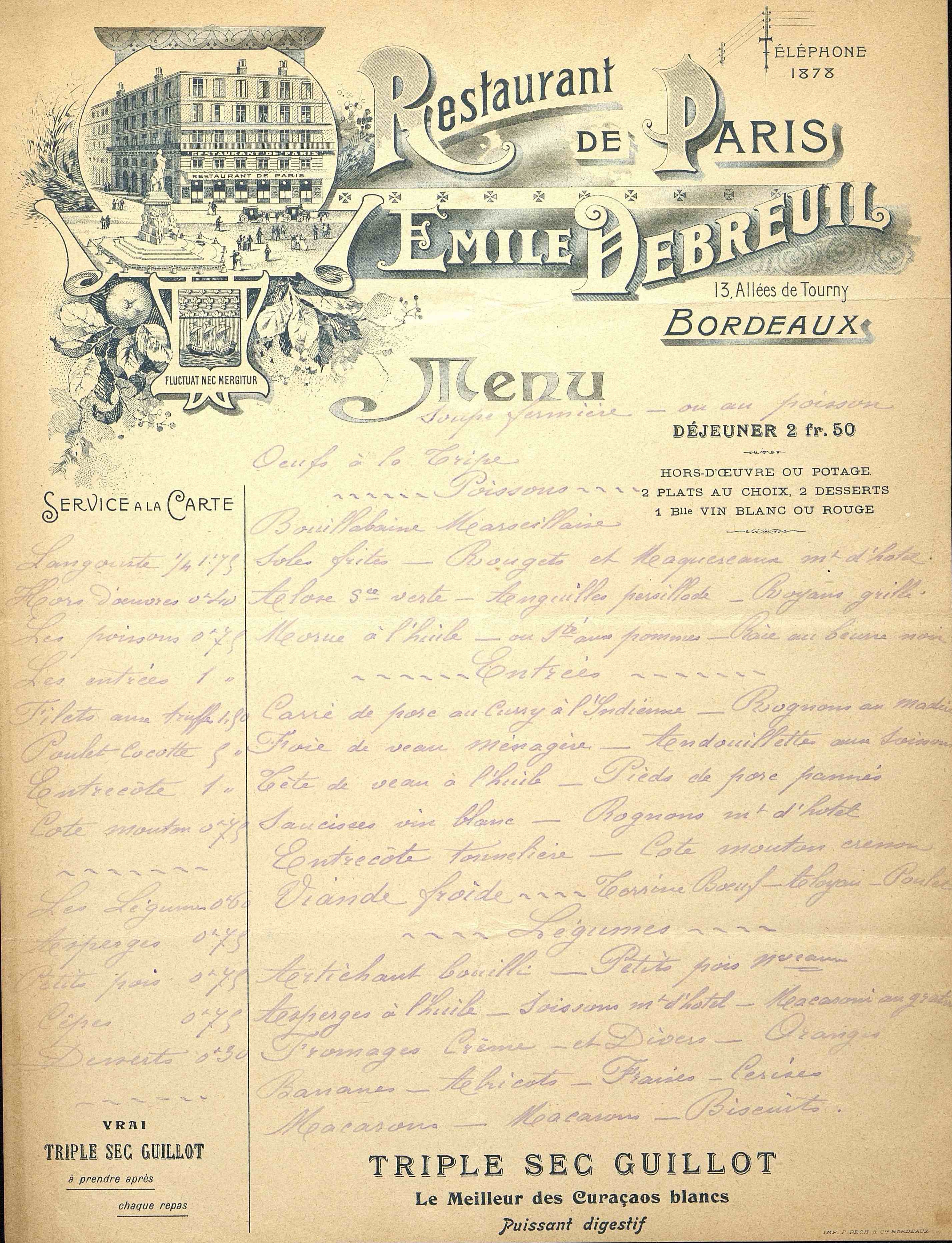 Carte du restaurant de Paris à Bordeaux. Peut-être destinée à l'affichage. Pré-imprimé, rempli en deux colonnes manuscrites avec les choix du menu et le service à la carte avec les tarifs. Publicité pour le Triple Sec Guillot. Sans date.