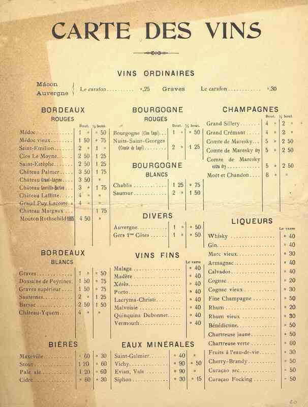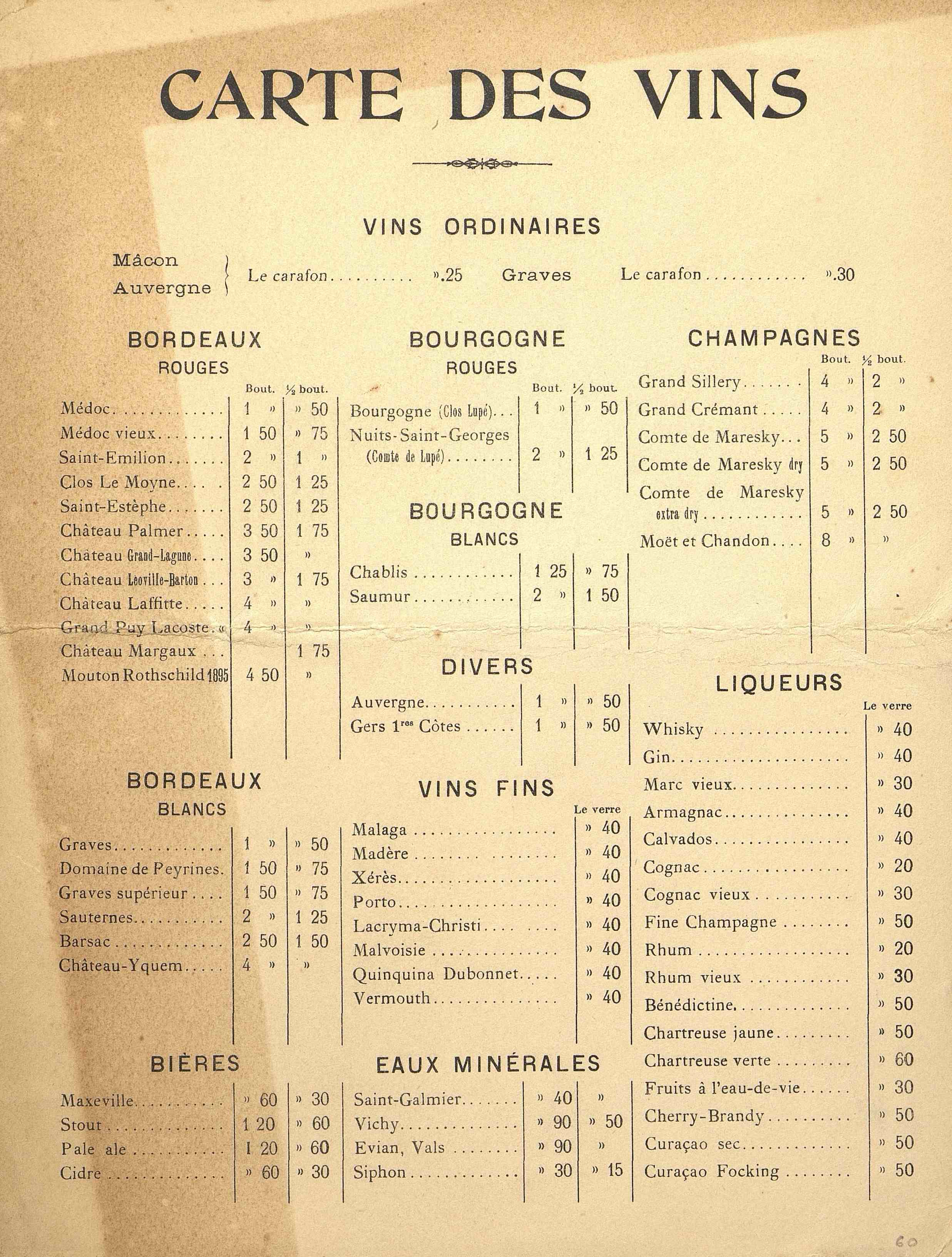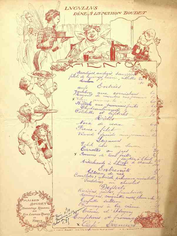 Menu-affichette pré-imprimé de la Maison Boudet, illustré et avec mentions manuscrites des plats et services avec les tarifs. Cette carte a peut-être servie aussi d'addition pour un repas comme semble l'indiquer une mention marginale. Au dos la carte des vins et tarifs. Sans date.