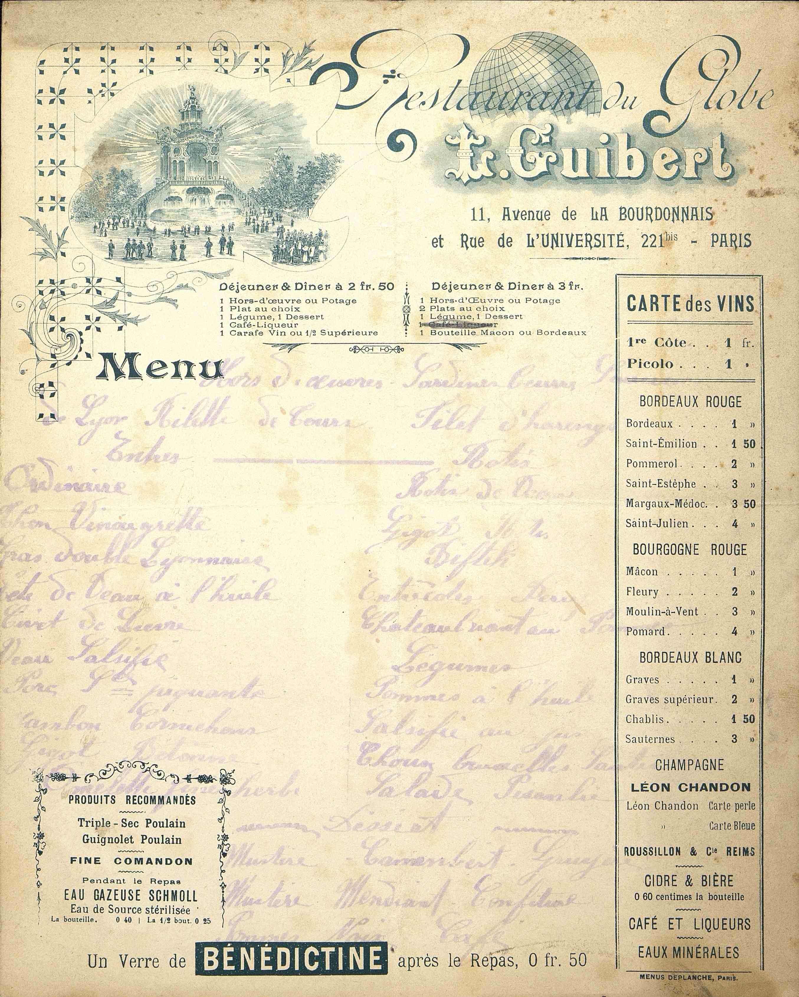 Carte illustrée du restaurant du Globe à Paris. Cette carte est pré-imprimée et porte divers plats servis en manuscrit. Écriture très altérée et difficilement lisible. Carte des vins et tarifs. Publicités. Sans date.