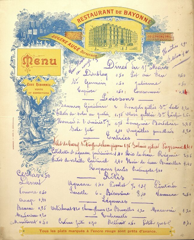 Menu-affichette du restaurant de Bayonne à Bordeaux.