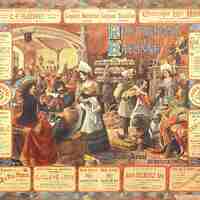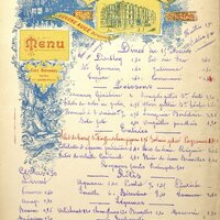 Menu de grand format ou affichette, ronéotypé, où il est indiqué diner du 15 mars sans l'année. Services et tarifs sur une page et au revers une représentation d'une d'auberge au XVIIe siècle. Cette illustration est entourée de cartouches publicitaires. Liqueur Batistine