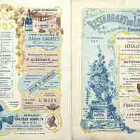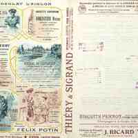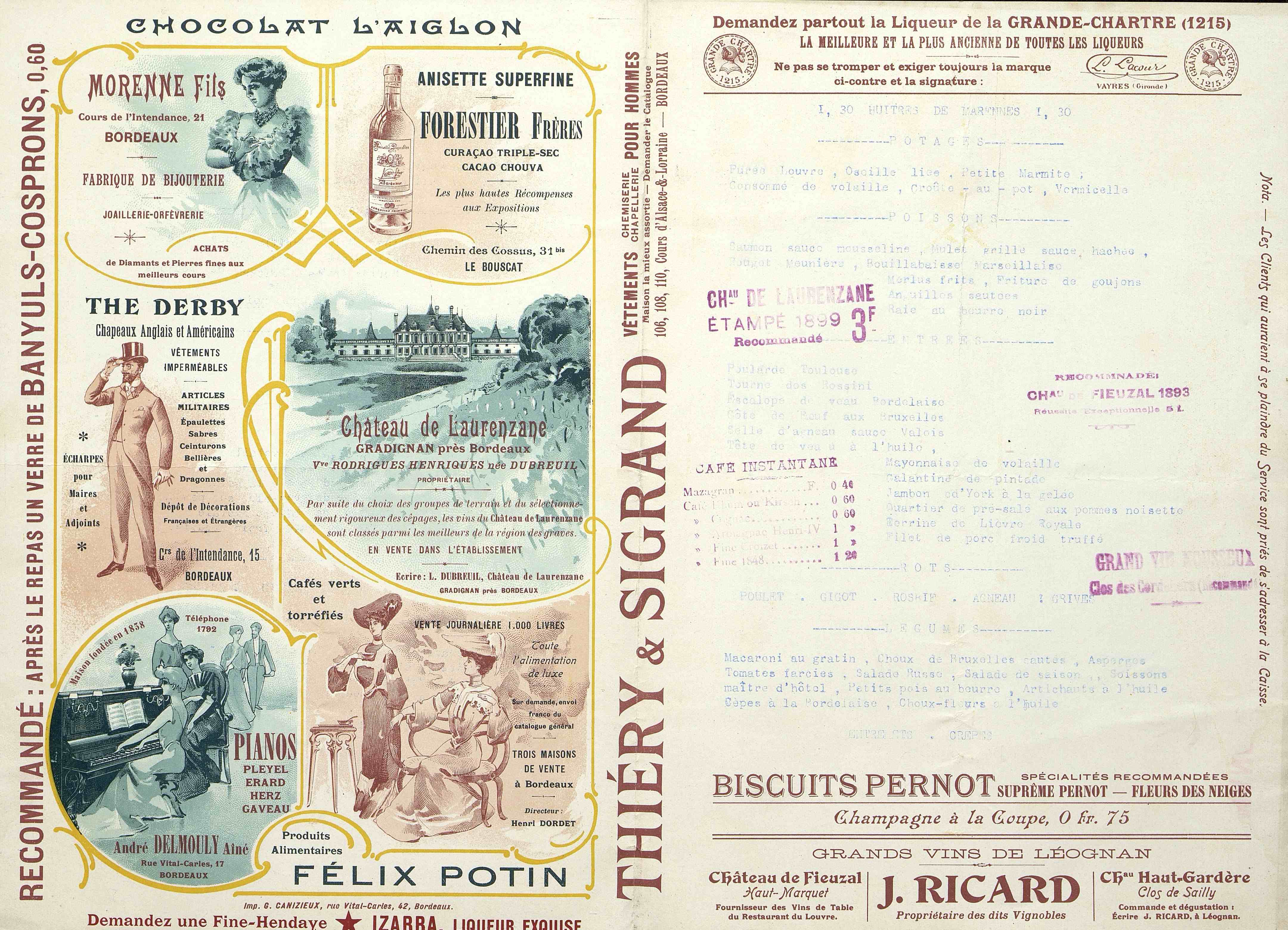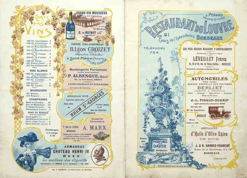 Pré-imprimé de la carte du restaurant du Louvre à Bordeaux. Menu ronéotypé sur lequel on a rajouté plusieurs tampons publicitaires pur des vins à l'encre rouge. Au dos la carte des vins. [s.d.]