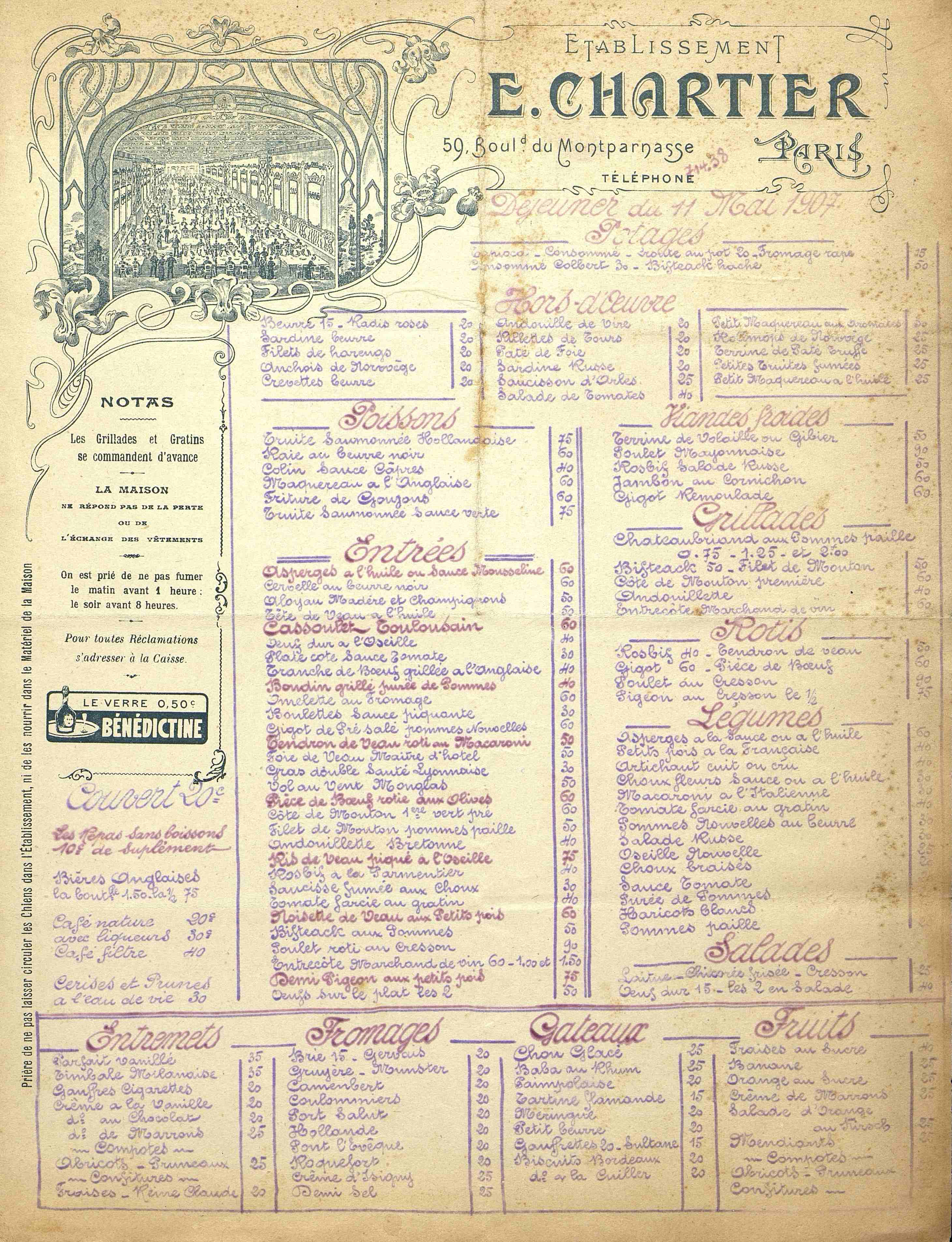 Carte-menu du Restaurant E. Chartier à Paris. Illustrée d'une vue de la salle de restaurant, manuscrite, ronéotypée avec les plats proposés et les tarifs. Au dos la carte des vins. Déjeuner du 11 mai 1907.