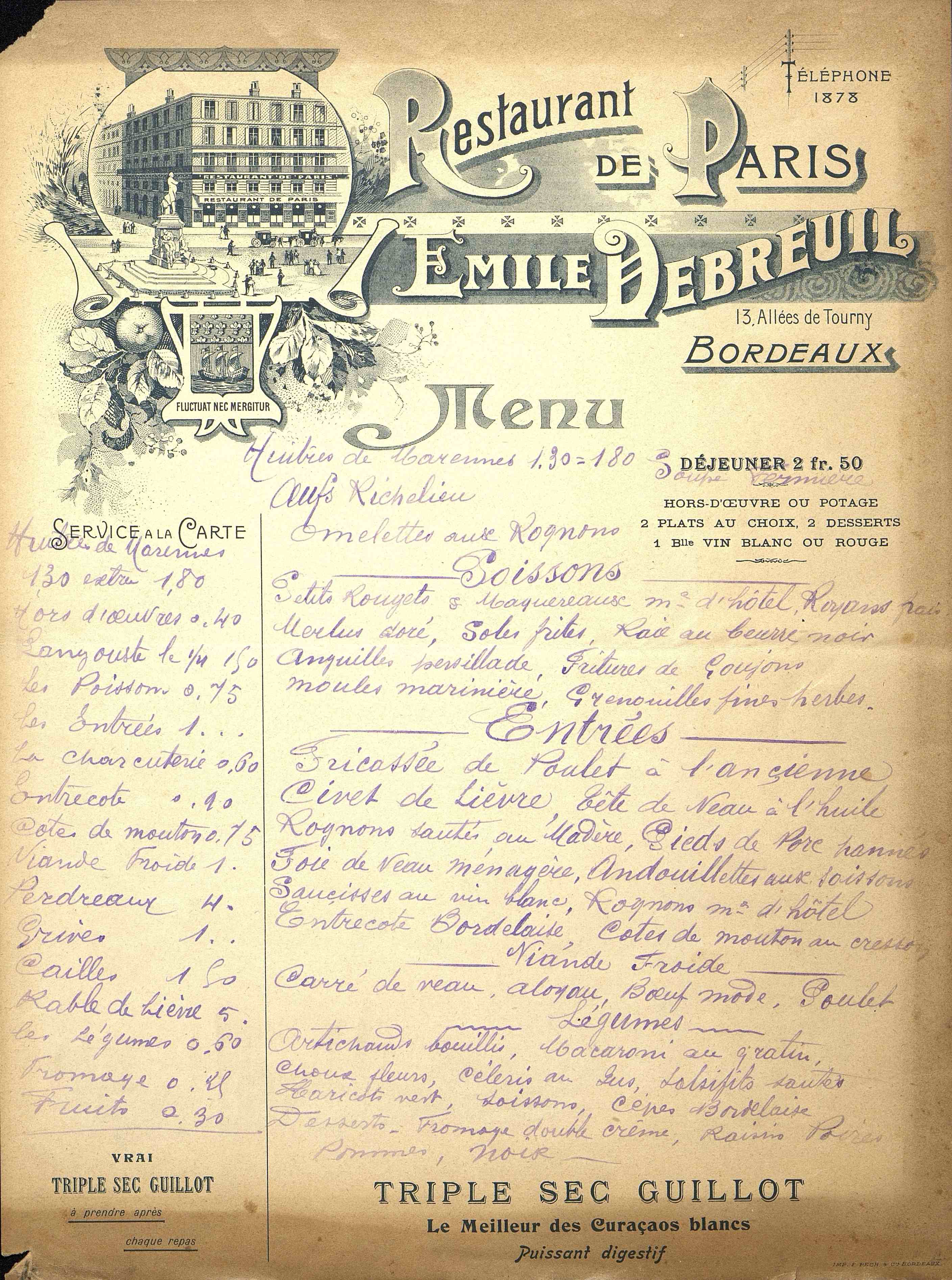 [Carte de restaurant. Bordeaux. s.d.]