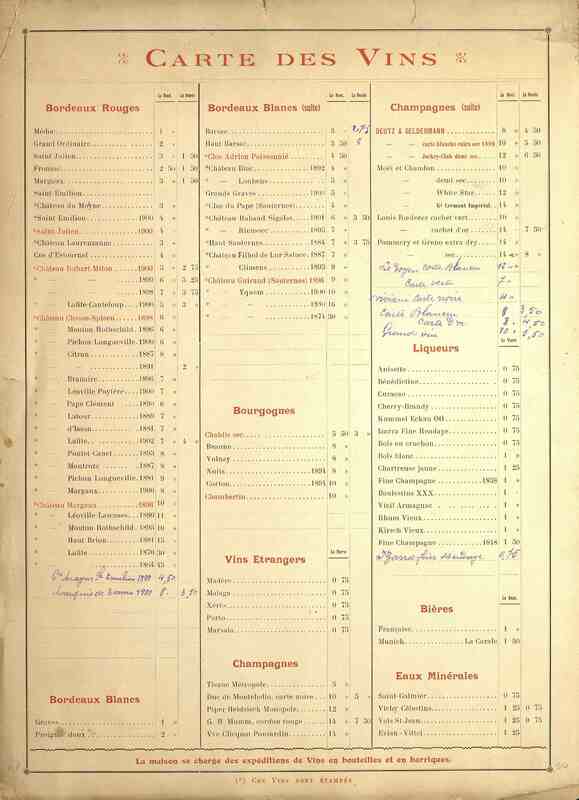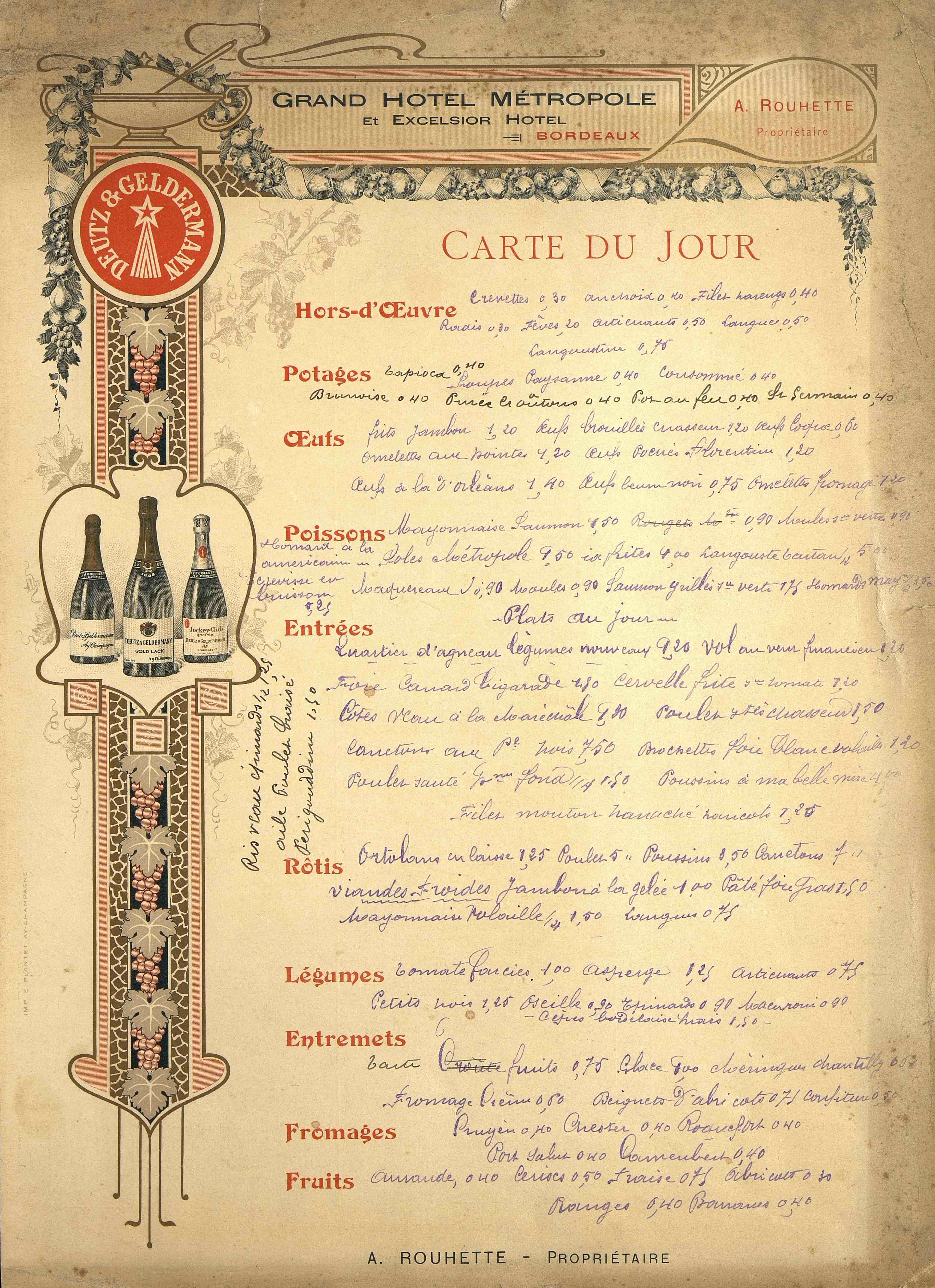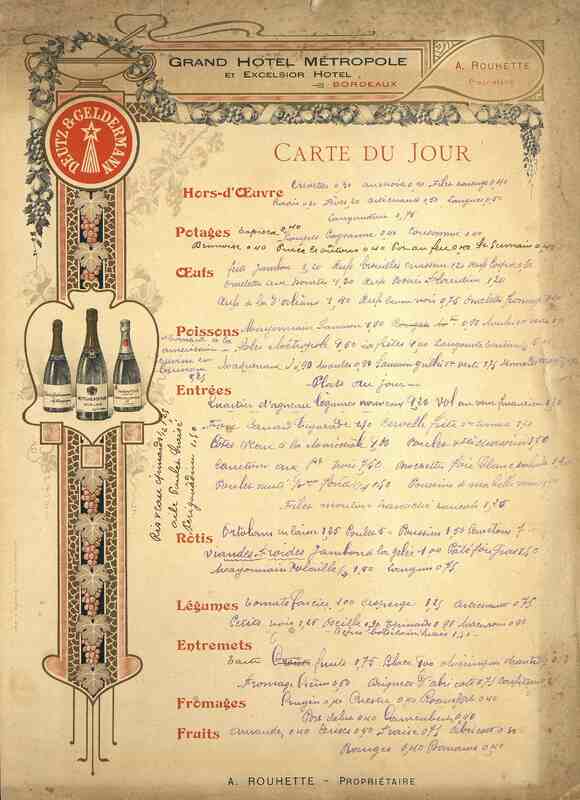 Menu-affichette du Grand Hôtel Métropole et Excelsior à Bordeaux. Plusieurs annonceurs publicitaires sur ce menu. Nombreuses mentions manuscrites au dos sur la carte des vins.