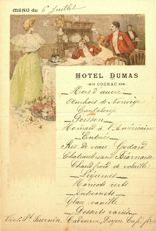 Plats servis : Hors d’œuvre : Anchois de Norvège. Cantaloup. Poisson : Homard à l'Américaine. Entrées : Ris de Veau Godard. Chateaubriand Béarnaise. Chaud-froid de volaille. Légumes : Haricots verts. Entremets : Glace Vanille. Desserts variés.