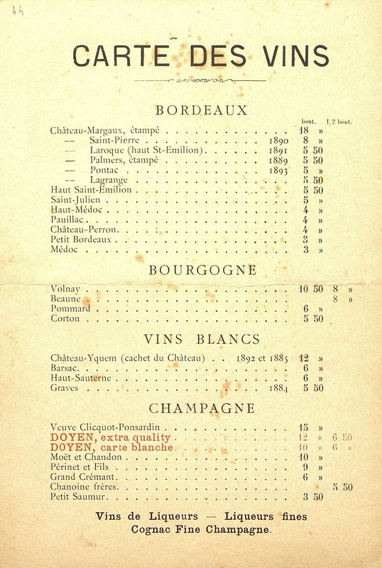 Illustration : Scène de toast au champagne Doyen dans un intérieur bourgeois de la Belle époque. Carte des vins au verso.