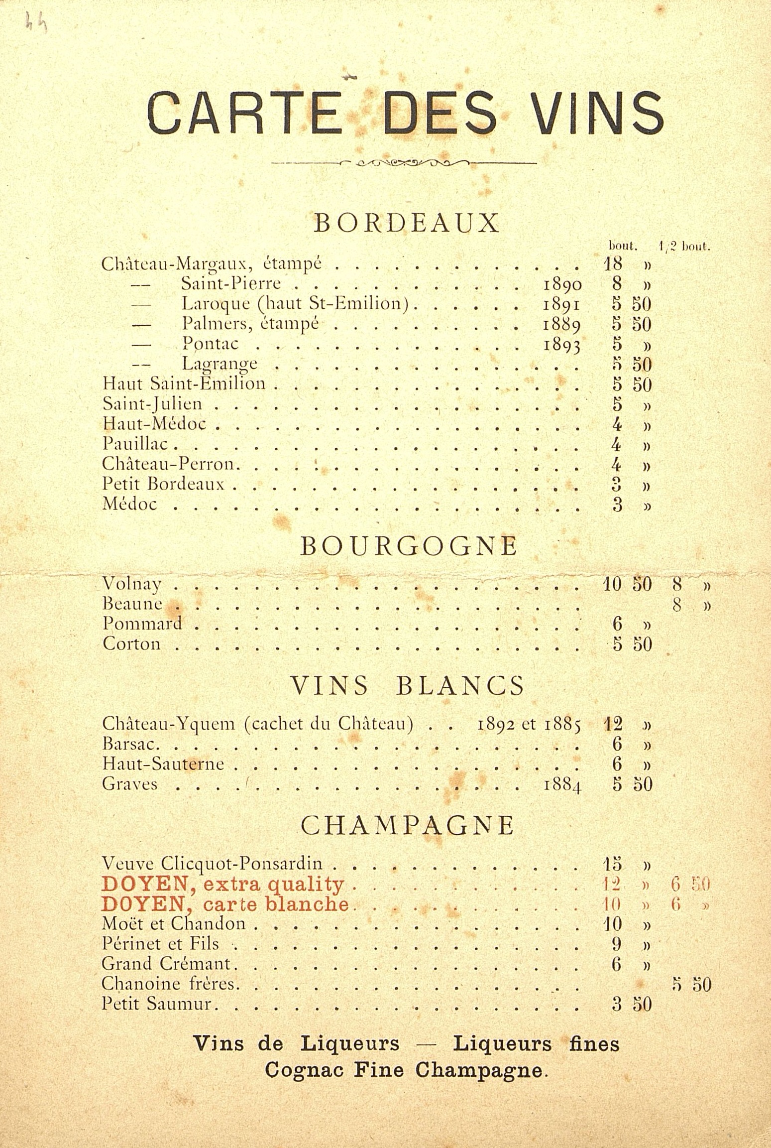 Boissons : Vins : St-Seurin . Cadourne, Doyen. Café, Fine.