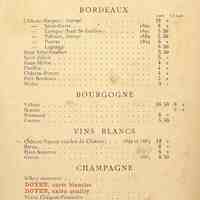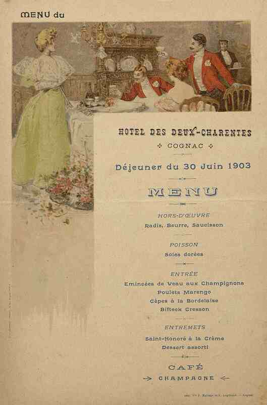 Plats servis : Hors-d’œuvre : Radis, Beurre, Saucisson. Poisson : Soles dorées. Entrée : Emincées de Veau aux champignons. Poulets Marengo. Cèpe à la Bordelaise. Bifteck Cresson. Entremets : Saint-Honoré à la Crème. Dessert assorti.