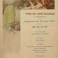 Illustration : Scène de toast au champagne Doyen dans un intérieur bourgeois de la Belle époque. Carte des vins au dos.