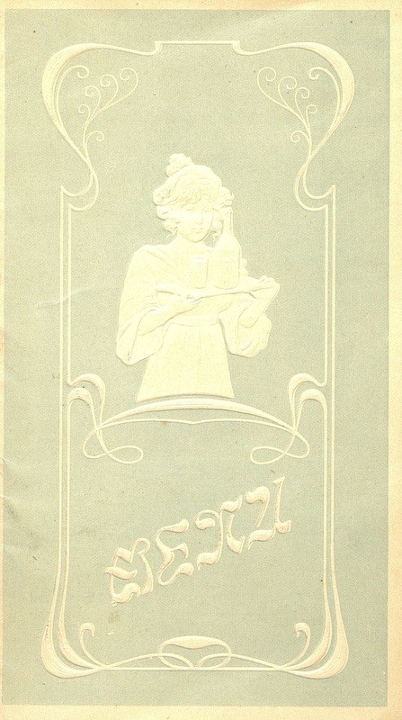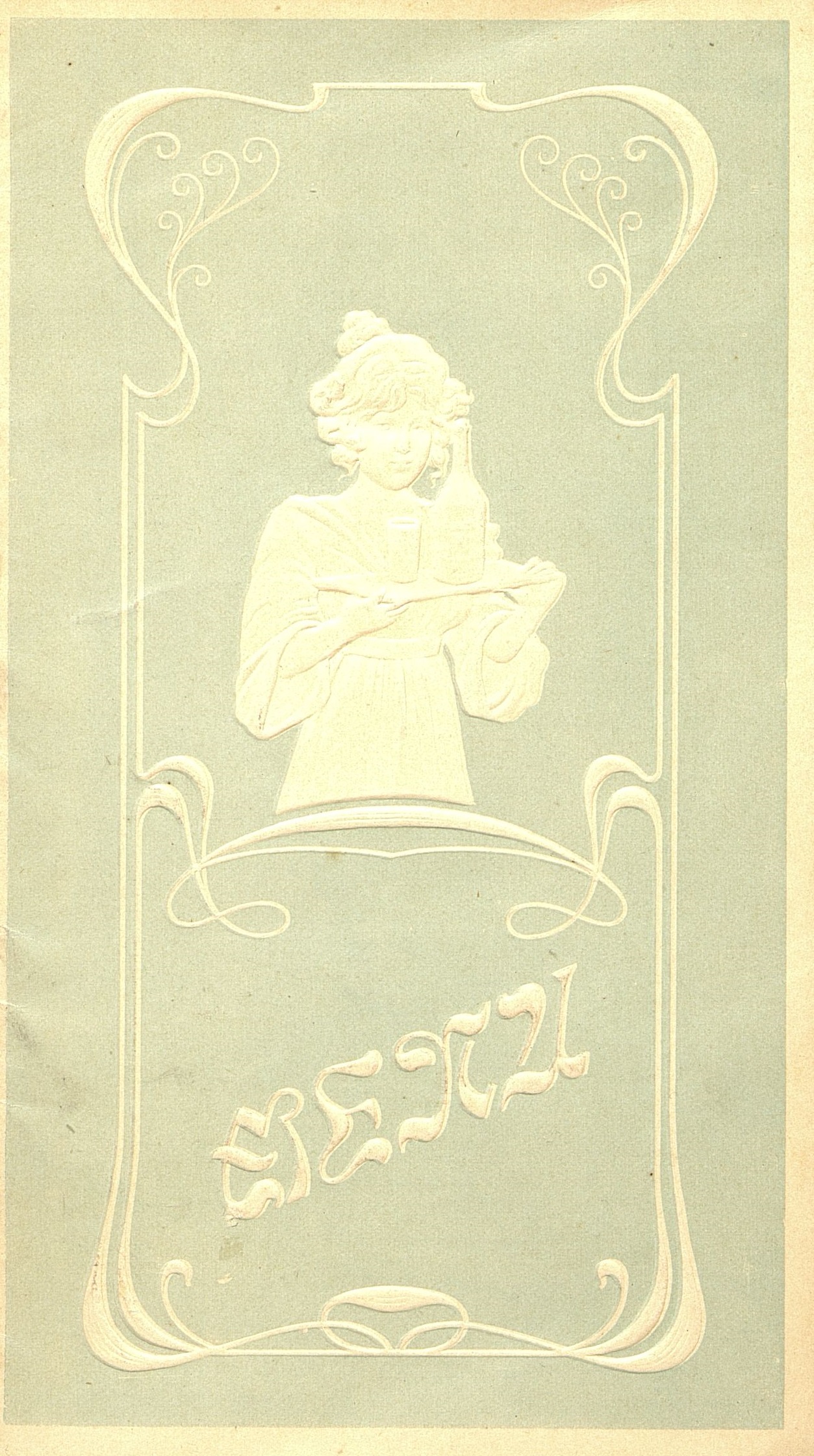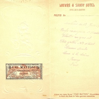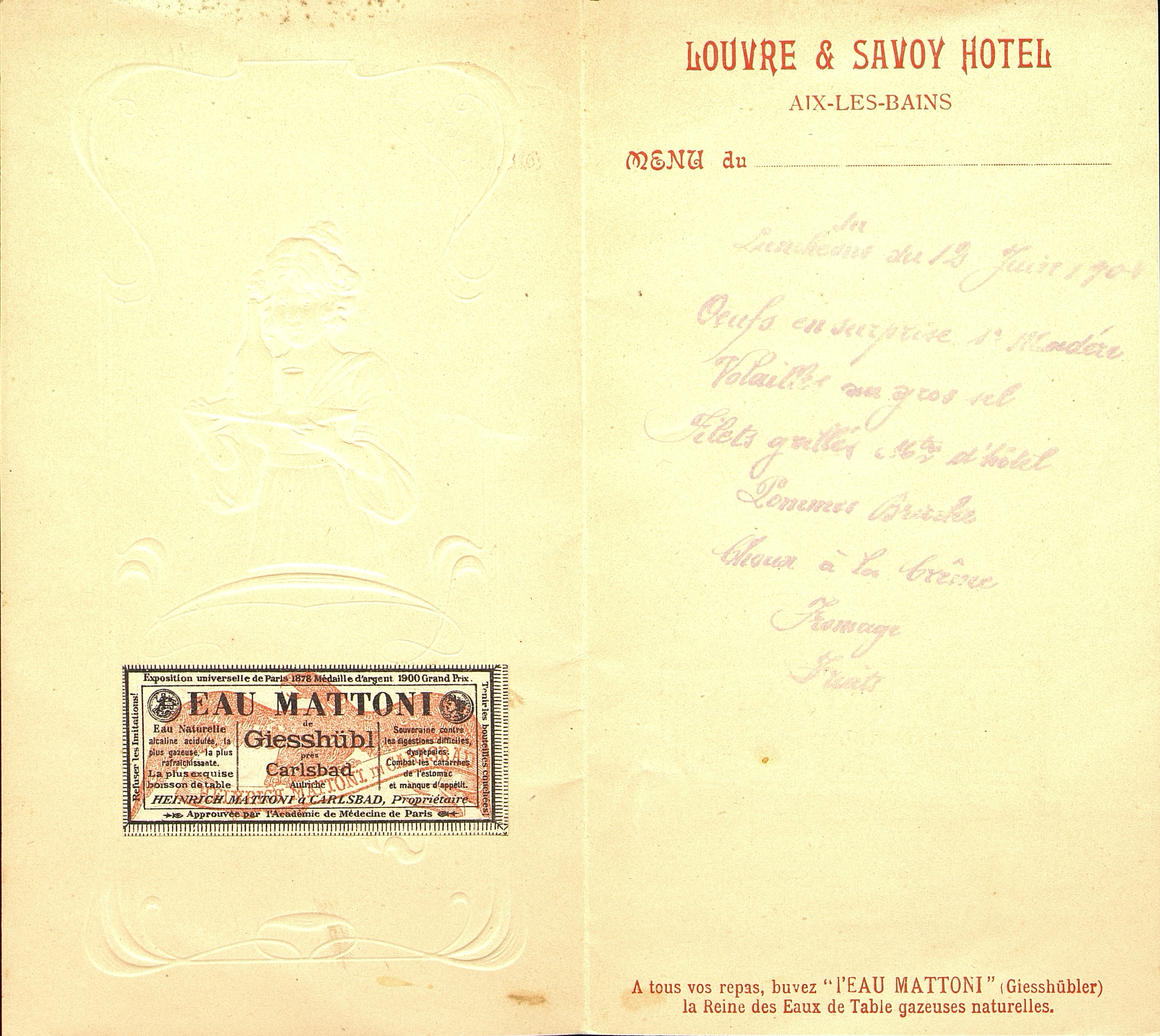 Illustration : Menu pliant du restaurant Louvre et Savoy Hôtel à Aix-les-Bains avec décor gaufré sur fond gris bleu au dessin nacré avec une femme portant un plateau de boissons . Un timbre publicitaire pour l'Eau Mattoni de Giesshübl près Carlsbad en Autriche.