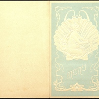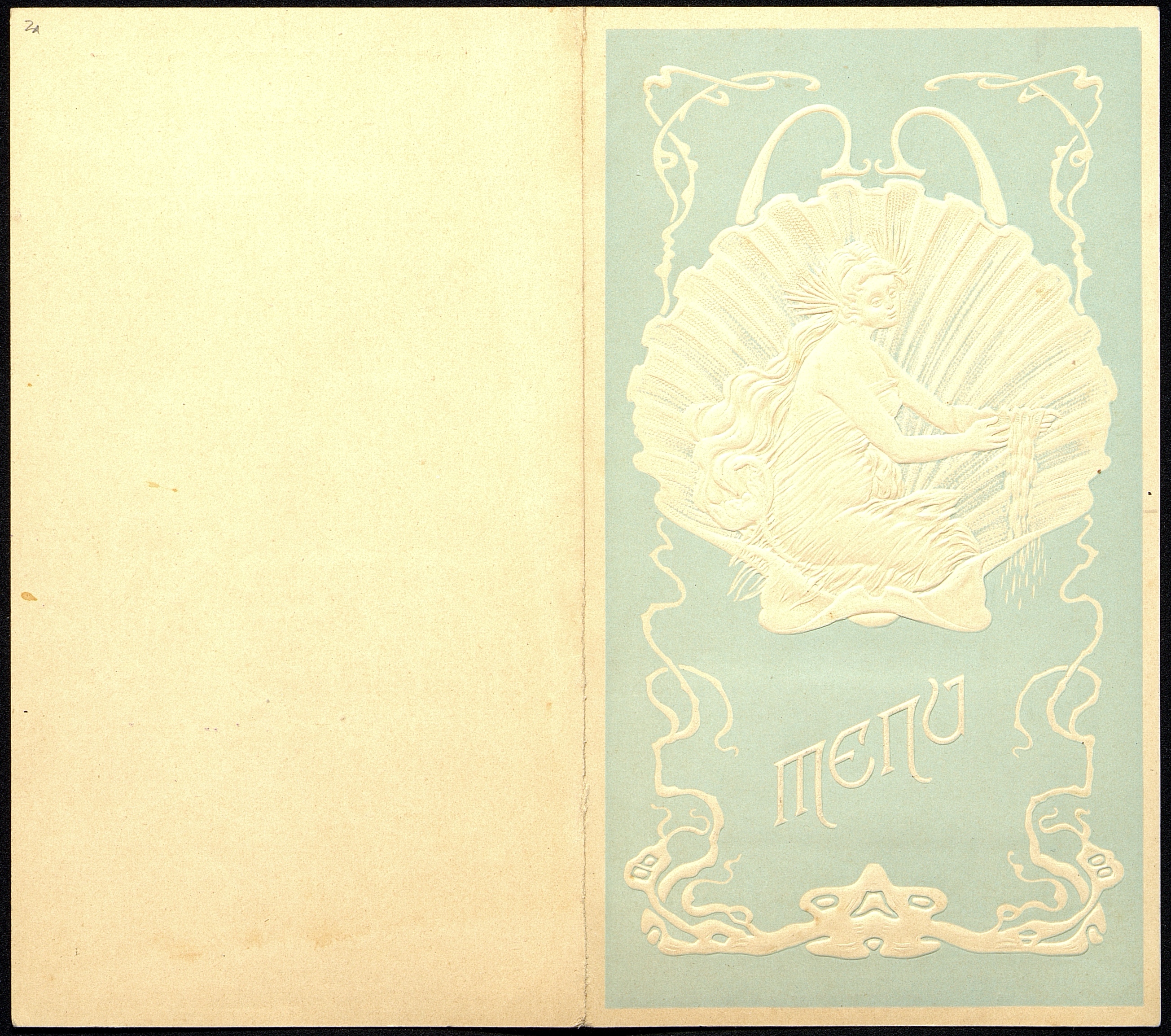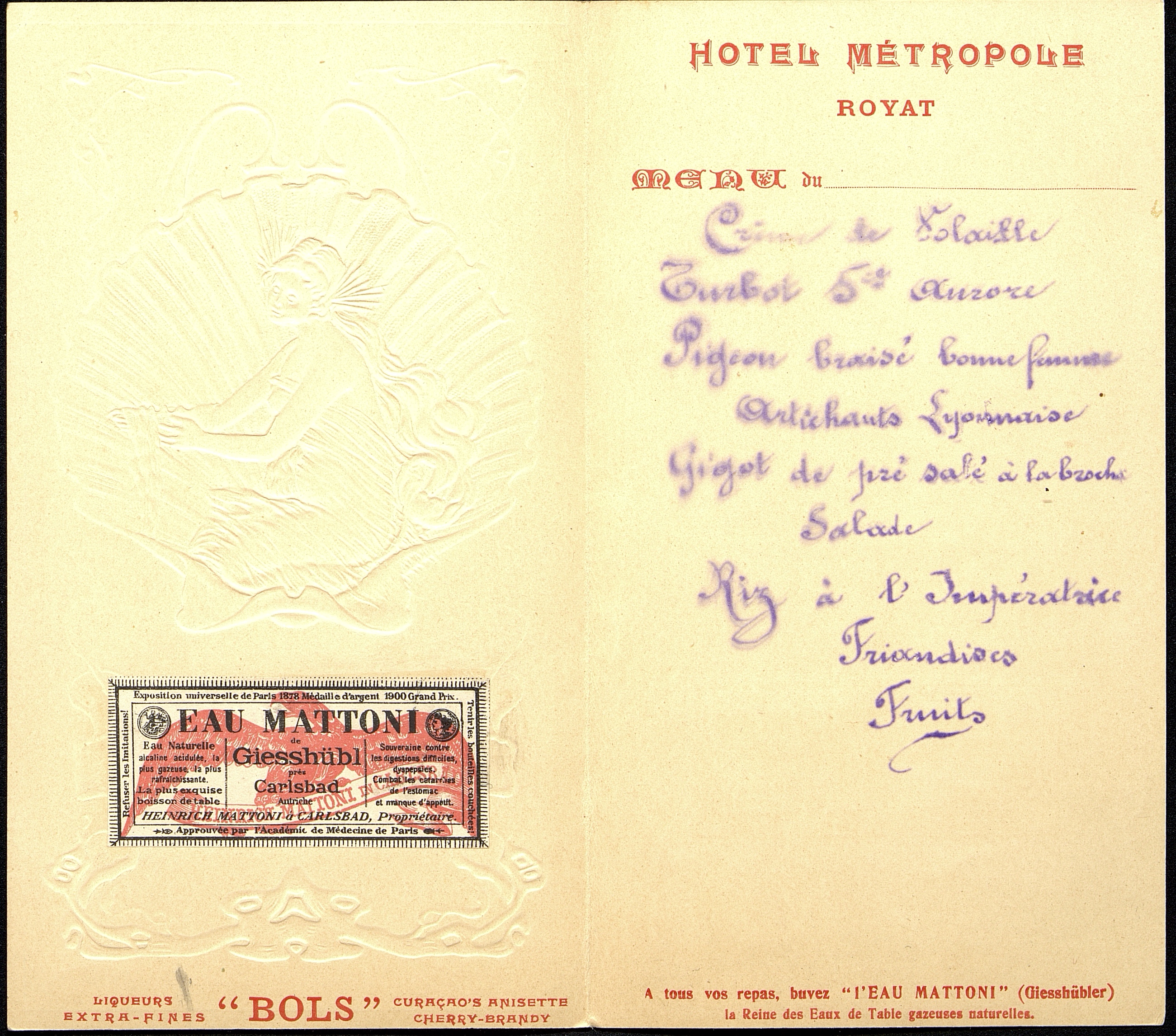 Illustration : Venus dans une coquille couleur nacre sur fond bleu clair en relief. Le menu porte un timbre publicitaire pour l'Eau Mattoni de Giesshübl près Carlsbad en Autriche. Autre publicité pour les alcools Bols d'Amsterdam.
